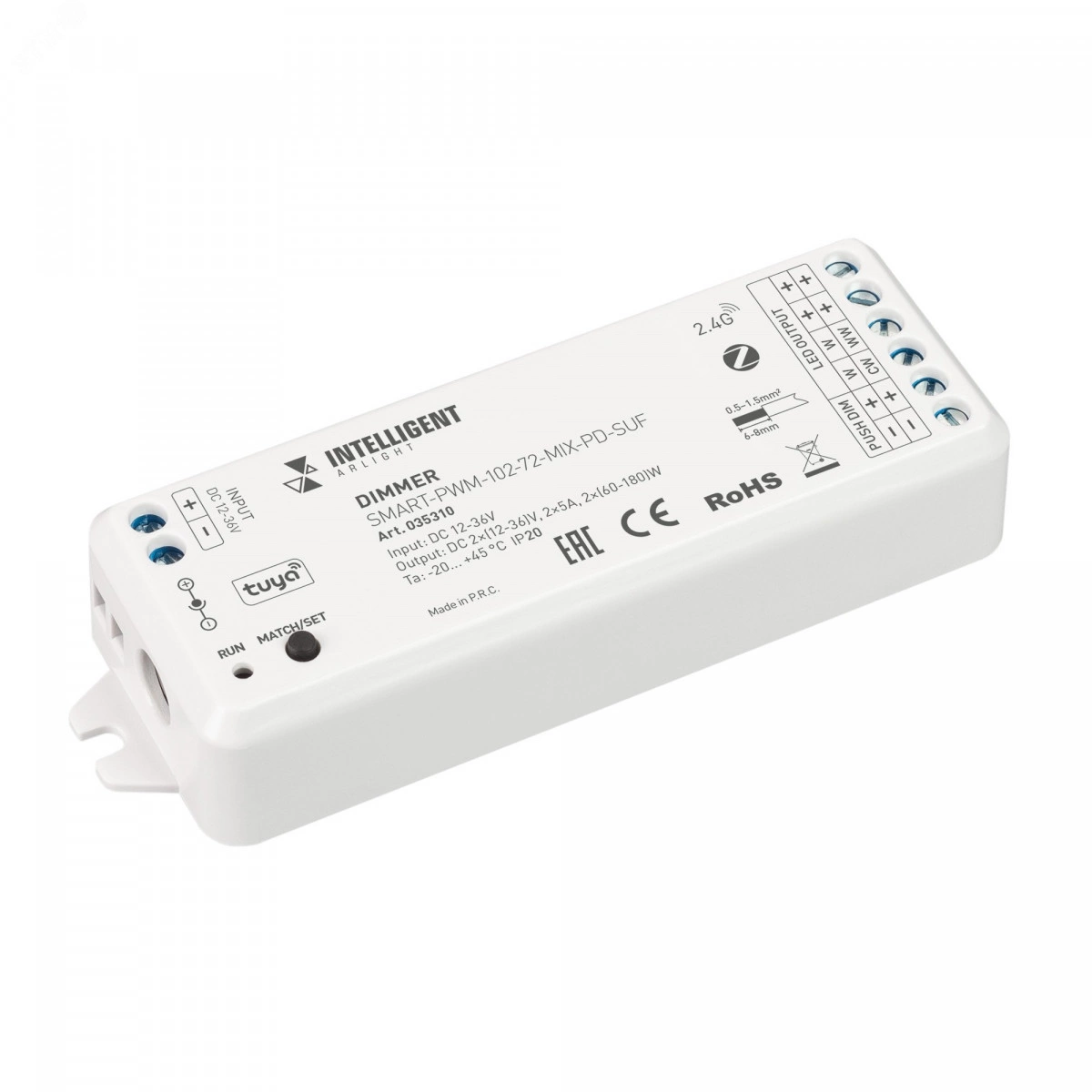 Диммер для управления одноцветной и мультибелой (MIX) светодиодной лентой с напряжением питания 12-36В. Выполняет основные фукнции- включение/выключение, регулировка яркости, изменение цветовой температуры. Управляется по ZigBee и совместим беспроводной облачной платформой TUYA и АЛИСА от ЯНДЕКС при использовании конвертера ZigBee-wifi. Управление со смартфона через приложение SMART LIFE. Устройство совместимо с радиочастотными пультами дистанционного управления и настенными панелями управления серии SMART. Возможна привязка до 10 пультов или панелей управления. Питание от 12-36В, 2 канала управления, максимальная нагрузка 5A на канал, выходная мощность 120-360 Вт (в зависимости от напряжения питания). Габариты устройства 114x38x20 мм.
