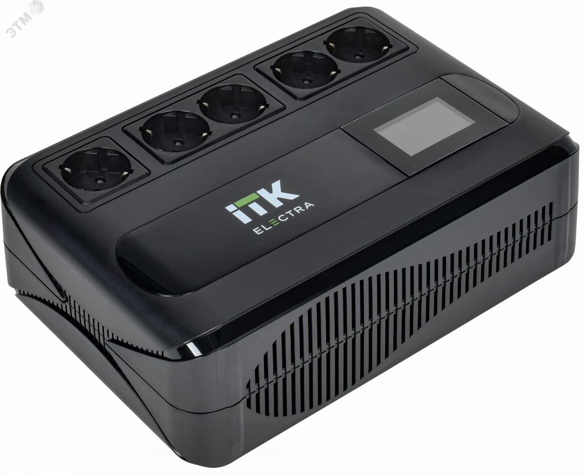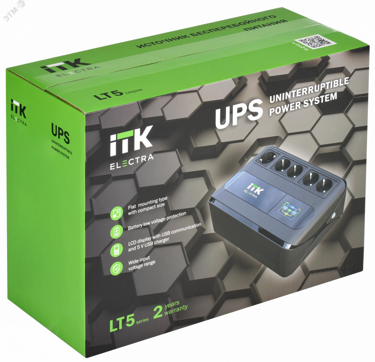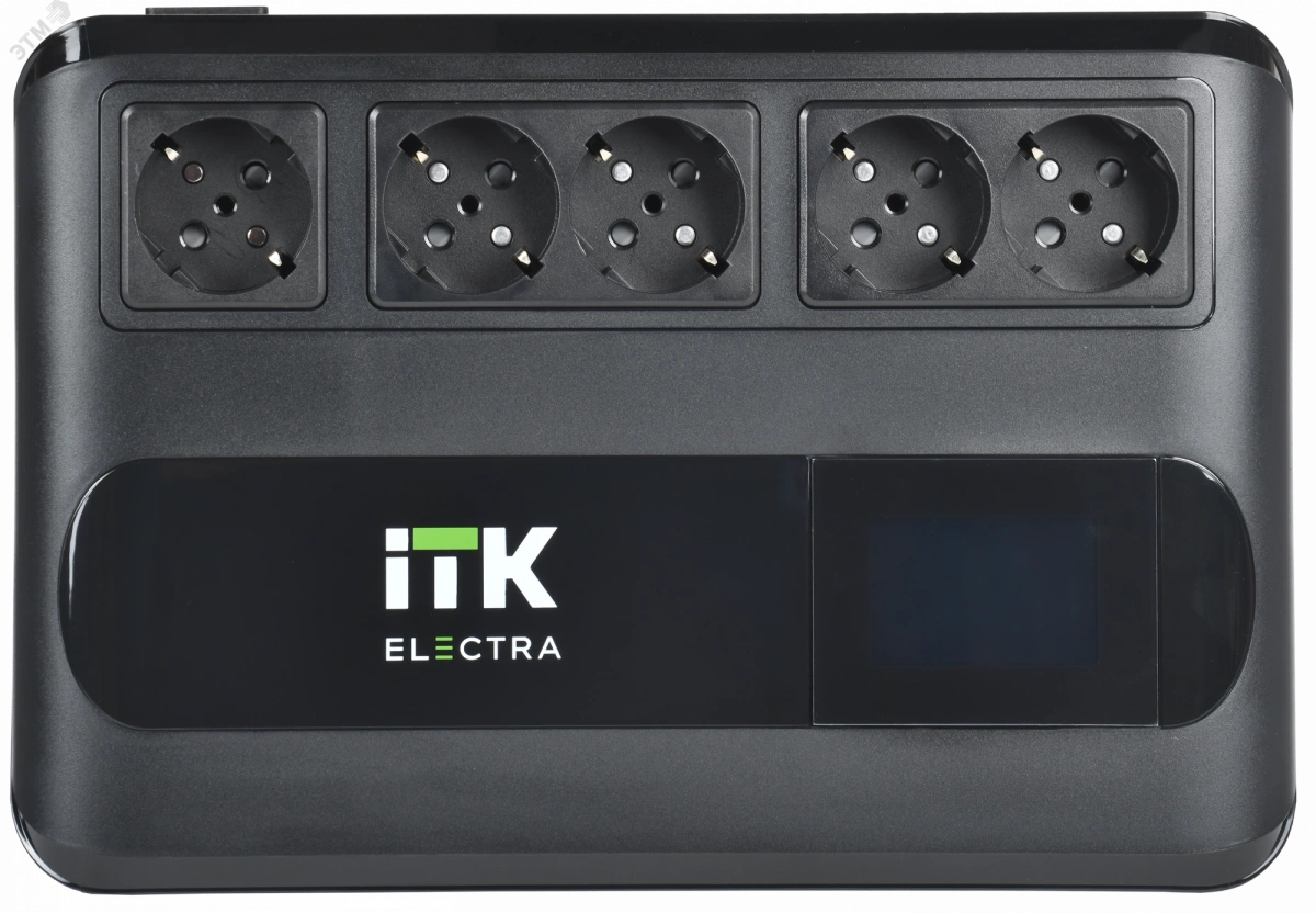 ITK ELECTRA LT5 - Линейно-интерактивный ИБП для обеспечения непрерывного питания электронного оборудования в офисах и бытовом применении. Он обеспечивает защиту от скачков напряжения, перебоев в электросети и потерь электропитания, а также обеспечивает комфорт и уверенность при работе с персональным компьютером, офисной техникой и сопутствующей периферией. ИБП прост в эксплуатации и оснащен 5 розетками SCHUKO и LCD дисплеем с USB разъемом. В ИБП встроена 1 свинцово-кислотная батарея на 9Ач.
