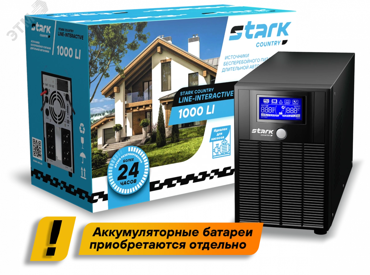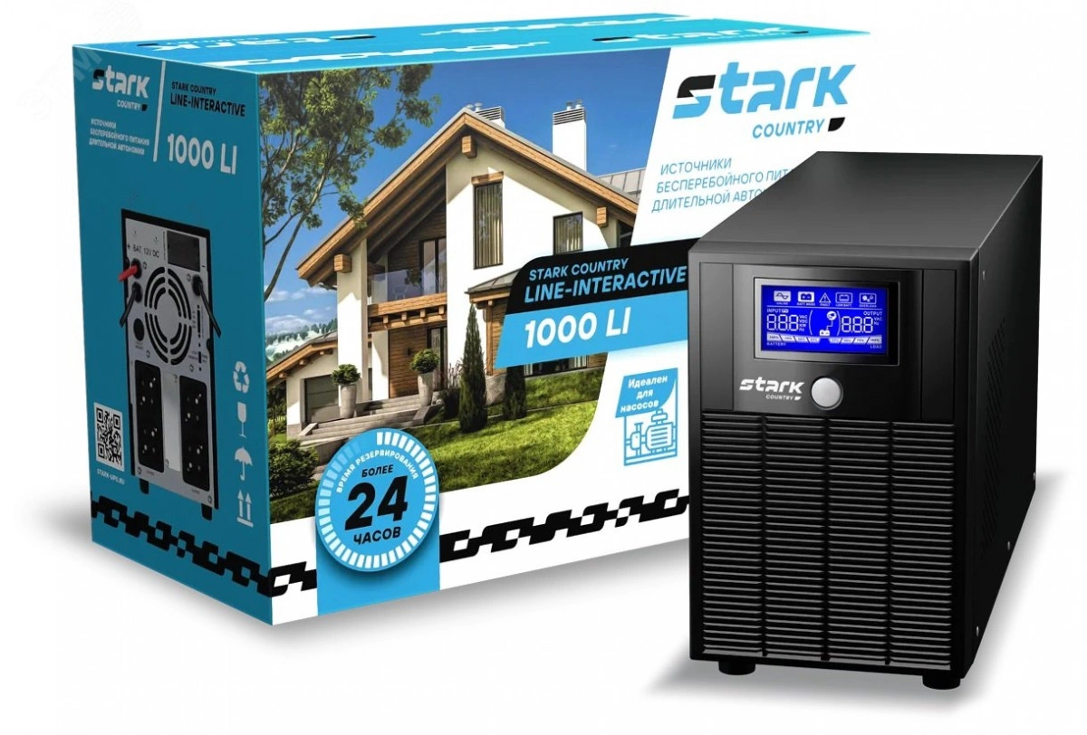 Линейно-интерактивный однофазный источник бесперебойного питания STARK COUNTRY 1000 LI производится мощностью 1000 ВА/600 Вт в напольном форм-факторе. ИБП работает только от 1 внешнего аккумулятора ёмкостью от 9 до 400 Ач (в комплект поставки не входит, батарея приобретается отдельно), программируемый зарядный ток - 20 А. Компактные размеры позволяют разместить его в практически любом помещении — он почти не занимает места и отлично подходит для вашего дома. Выводы ИБП выполнены в виде