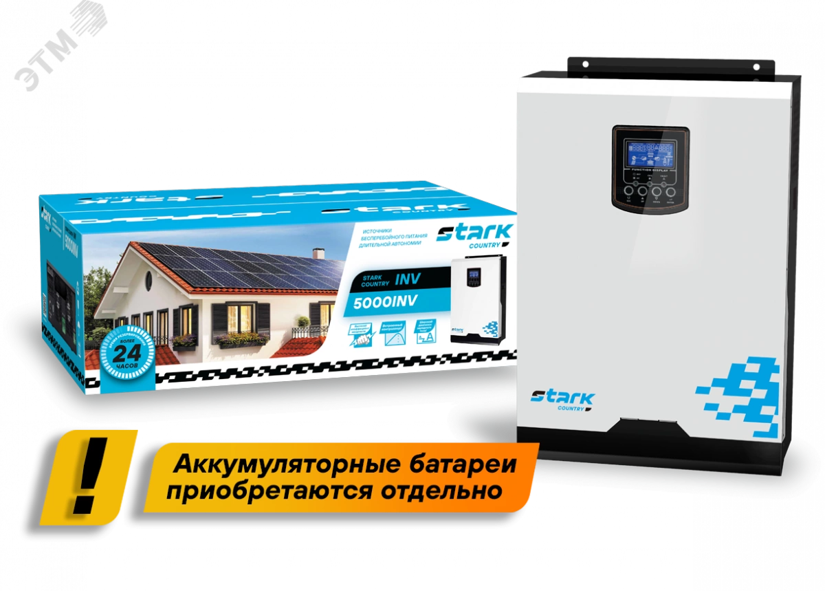Однофазный ИБП STARK COUNTRY 5000 INV производится мощностью 5000 ВА/5000 Вт в настенном форм-факторе. Его главная особенность — работа в паре с солнечными панелями (внутри источника установлены встроенные контроллеры). Это позволяет использовать источник для питания мобильных домов, яхт и позволяет не зависеть от перебоев сети. Также со временем можно наращивать мощность - параллельно могут работать до 3 ИБП. Однофазный оффлайн источник бесперебойного питания STARK COUNTRY 5000 INV совместим с любыми видами генераторов. Он обеспечивает потребителей качественным током — напряжение на выходе с батарей имеет форму чистой синусоиды. Помимо этого, ИБП имеет широчайший диапазон настроек, что позволяет адаптировать его под любые запросы. Максимальный ток зарядного устройства - 60 А. Максимальная емкость заряжаемых аккумуляторов 1200 Ач. Количество последовательно соединенных аккумуляторов - 4 шт.