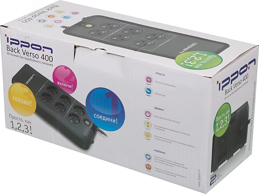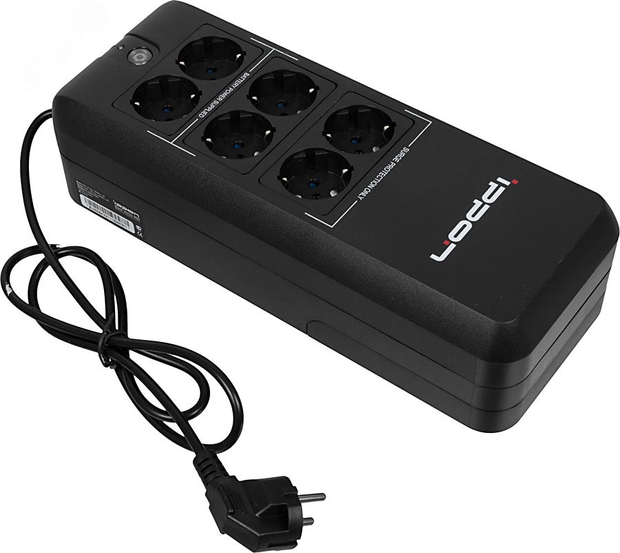 Источник бесперебойного питания Off-Line 400 ВА, 220/220 АС, Нагрузка 200 Вт, Ступенчатый сигнал, 1 АКБ 12 В, 4.5 Ач, Защита от перегрузки и КЗ, RJ-45, 4 бат Schuko, 2 фильтр Schuko, от 0 до +40 градусов C, 320х125х86 мм. В автономном режиме автоматически отключается через 30 минут. Предназначен для использования как в офисе, так и дома для защиты техники от основных неполадок с электропитанием в сети.