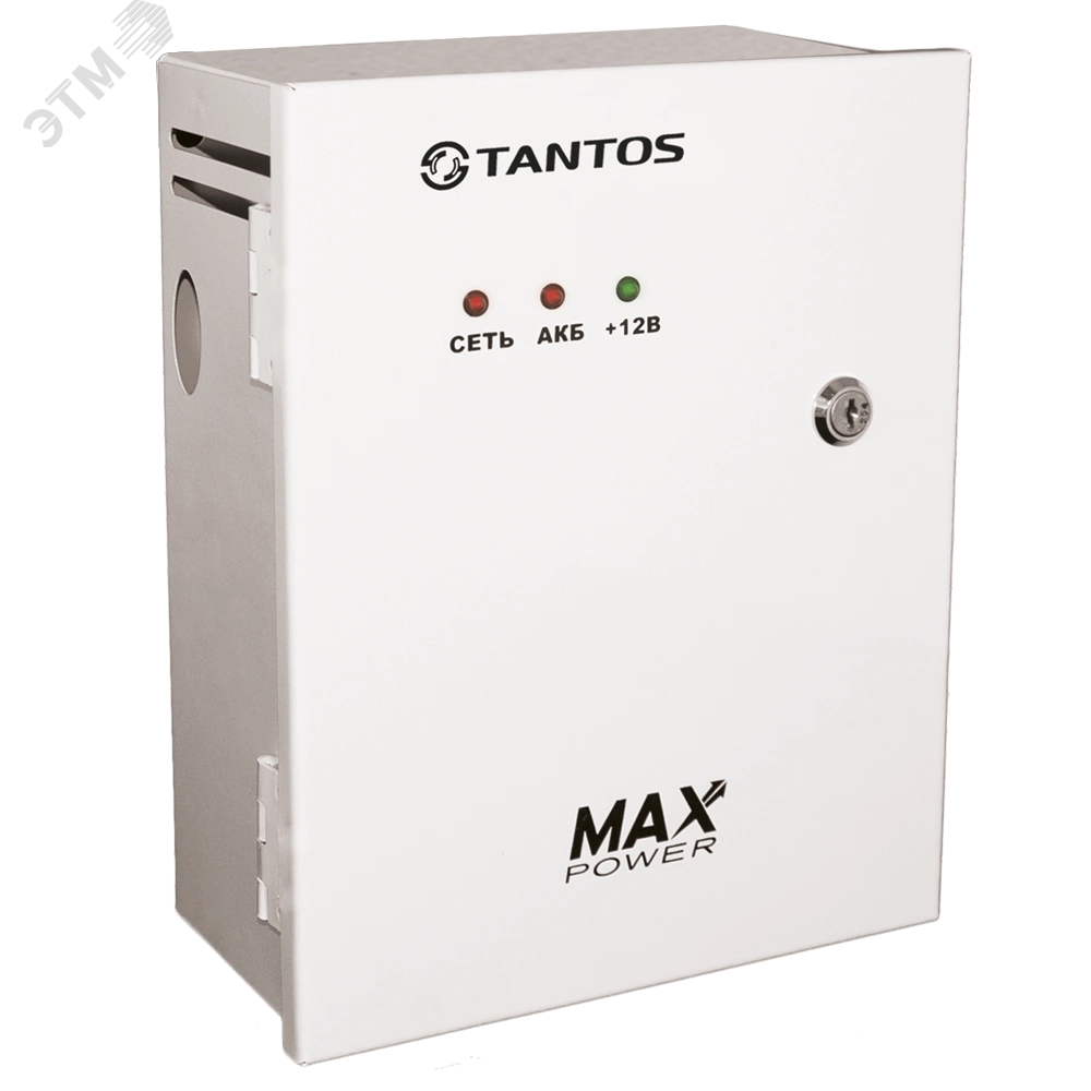 Источник вторичного электропитания резервированный Tantos ББП-65 MAX предназначен для обеспечения бесперебойного электропитания потребителей при номинальном напряжении 12В постоянного тока и токе потребления до 6.5А с защитой от глубокого разряда АКБ, электронная защита от КЗ.