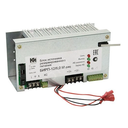 Блок источника резервного питания. Основной источник электропитания сеть переменного тока 150 - 265В 50 Гц, выходное напряжение постоянного тока 12 В, номинальный ток нагрузки 6.0 А, максимальный ток нагрузки 6,5 А, под два внешних аккумулятора 12 В 7-12 Ач, световая индикация - Сеть/Выход/АБ разряжена/Заряд АБ. Информационные выходы 'оптореле' о наличия выходного напряжения, наличии АБ , наличии сети. Электронная защита от короткого замыкания, защита аккумулятора от глубокого разряда. Клеммные колодки барьерного типа, габаритные размеры 190х100х90 мм, металлический кожух IP10 вес 1.0 кг