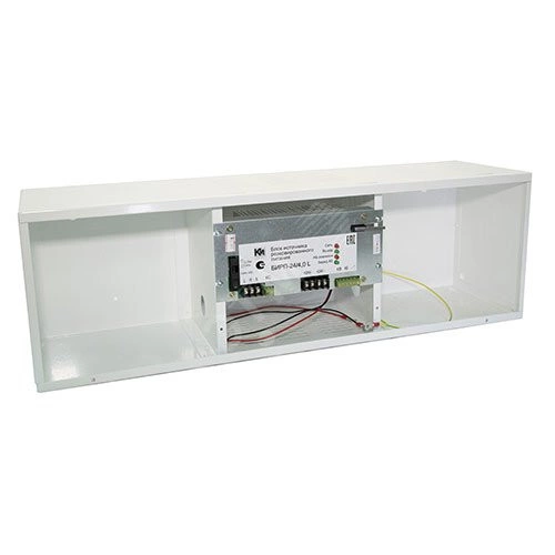 Блок источника резервного питания. Основной источник электропитания сеть переменного тока 150 - 265В 50 Гц, выходное напряжение постоянного тока 24 В, номинальный ток нагрузки 4.0 А, максимальный ток нагрузки 4,5 А, под два аккумулятора 12 В 26-40 Ач, световая индикация - Сеть/Выход/АБ разряжена/Заряд АБ. Информационные выходы 'оптореле' о наличия выходного напряжения, наличии АБ , наличии сети, тампер. Электронная защита от короткого замыкания, защита аккумулятора от глубокого разряда, габаритные размеры 654х210х175 мм, металлический корпус, IP30. вес 10.0 кг
