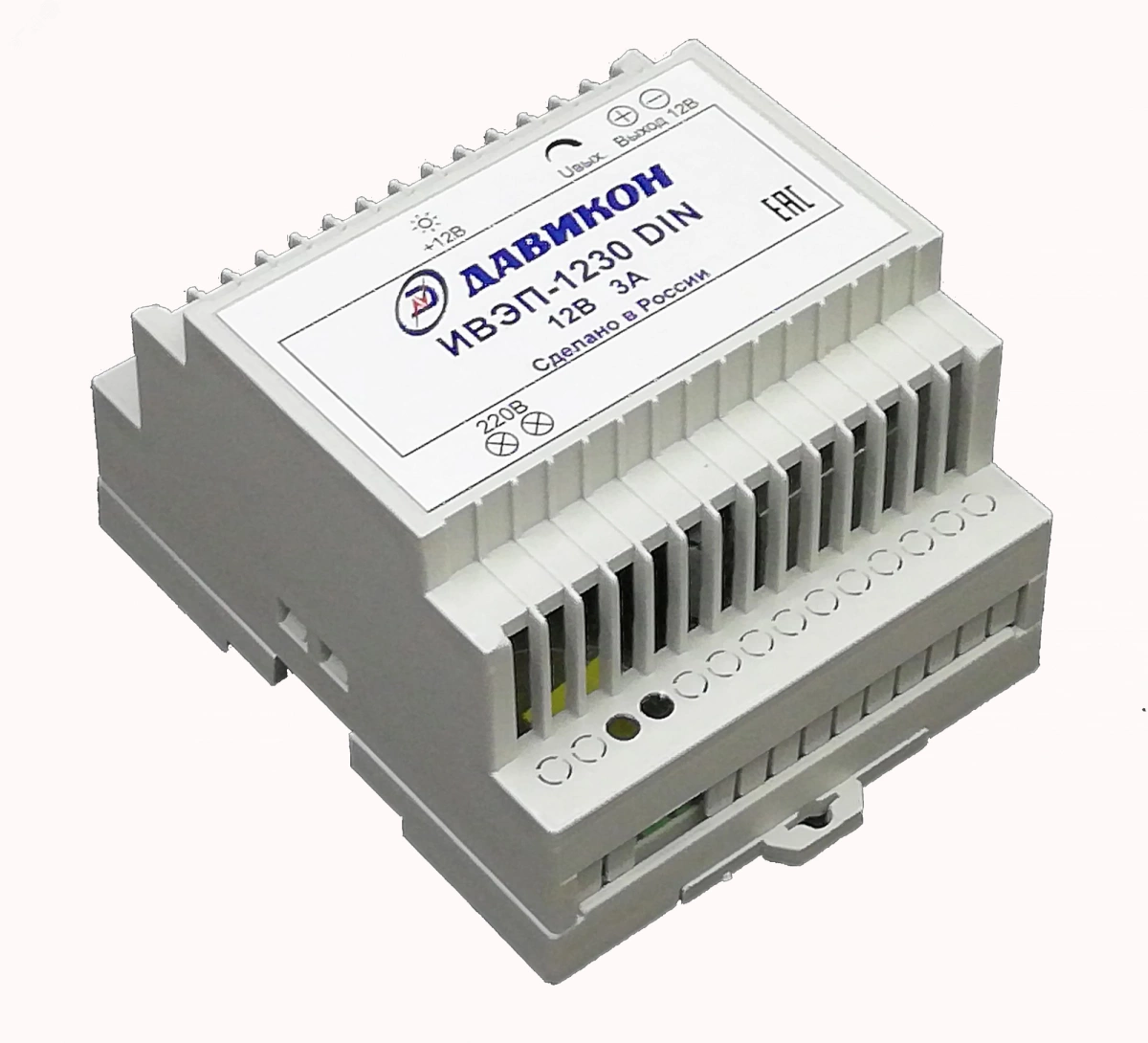 Источник вторичного электропитания Давикон ИВЭП-1230DIN предназначен для установки внутри помещения и рассчитан на круглосуточный режим работы. Отличительные особенности ИВЭП - электронная защита от короткого замыкания и перегрузки по току, защита от пробоя вход-выход 4000В, автоматическое восстановление выходного напряжения после снятия короткого замыкания или перегрузки, защита от перегрузки по входу, неограниченное время нахождения в состоянии короткого замыкания. размер 78x93x56mm, Конструктивно ИВЭП-1220 DIN выполнен в неразборном корпусе. Для подключения прибора к сети переменного тока 220В предусмотрен сетевой шнур с плоской вилкой. На выходе прибора предусмотрен шнур со штекером для подключения питания потребителей.