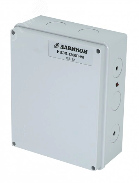 Давикон ИВЭП-1260П-V8 - источник вторичного электропитания стабилизированный с распределённым выходом и защитой от КЗ по каждому каналу (самовосстановление предохранителя после КЗ), индикация работы каждого канала. Предназначен для обеспечения электропитания потребителей при номинальном напряжением 11,5 - 14,5В постоянного тока 6А (максимальный 6,5А).
