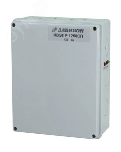 Источник вторичного электропитания резервированный Давикон ИВЭПР-1250СП предназначен для установки внутри помещения и рассчитан на круглосуточный режим работы. Обеспечивает автоматический переход на питание от аккумулятора при отсутствии напряжения сети. Конструктивно источник питания размещен в пластиковом корпусе (не поддерж. горение, не требует заземления) с открывающейся передней крышкой. Имеется возможность установки АКБ ёмкостью 7А/ч, регулировки выходного напряжения в пределах от 11 до 14 В, номинальный ток 5 А, максимальный – 5,5 А.