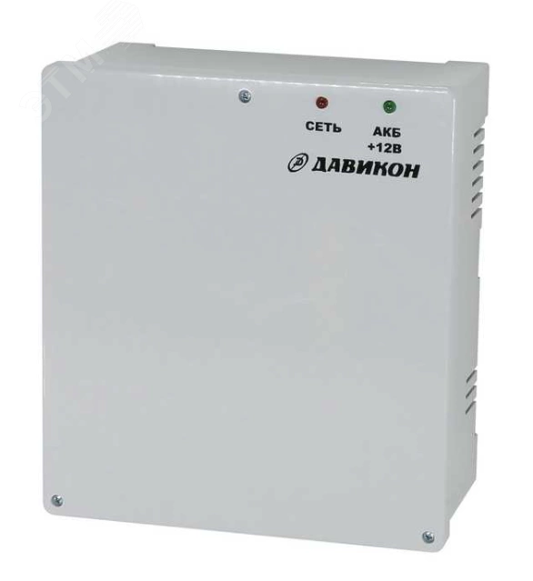 Источник вторичного электропитания резервированный Давикон ИВЭПР-1260АП предназначен для установки внутри помещения и рассчитан на круглосуточный режим работы. Обеспечивает автоматический переход на питание от аккумулятора при отсутствии напряжения сети. Конструктивно источник питания размещен в пластиковом корпусе (не поддерж. горение, не требует заземления) с открывающейся передней крышкой. Имеется возможность установки АКБ ёмкостью 7А/ч, регулировки выходного напряжения в пределах от 11 до 14 В, номинальный ток 6 А, максимальный – 6,5 А. Защита АКБ от глубокого разряда, от переполюсовки клемм батареи реализована за счет упрощенного, но надёжного алгоритма работы схемы его включения. Допускается продолжительное время нахождения источника питания в режиме короткого замыкания или перегрузки.