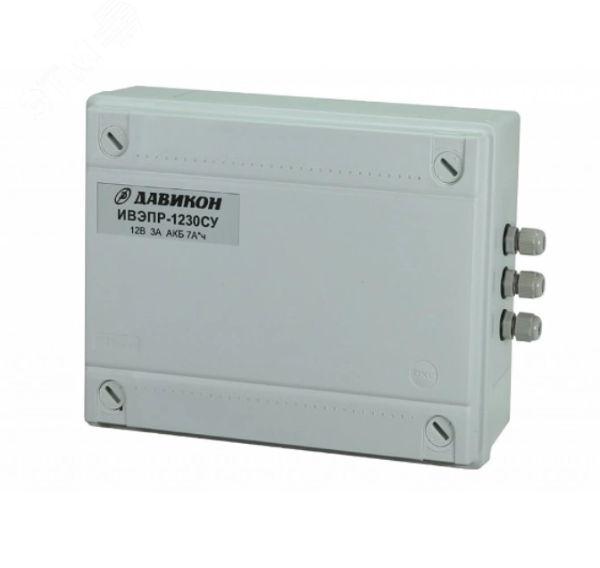 Источник вторичного электропитания резервированный Давикон ИВЭПР-1230СУ уличного исполнения. Номинальный выходной ток 3А (максимум 3.5А). Предназначен для обеспечения бесперебойного электропитания потребителей при номинальном напряжением 13,5В постоянного тока. Данный источник бесперебойного питания предназначен для уличной установки, рассчитан на круглосуточный режим работы, и обеспечивает автоматический переход на питание от аккумулятора (в комплект не входит) при отсутствии напряжения сети. Корпус источника выполнен из герметичного пластика.