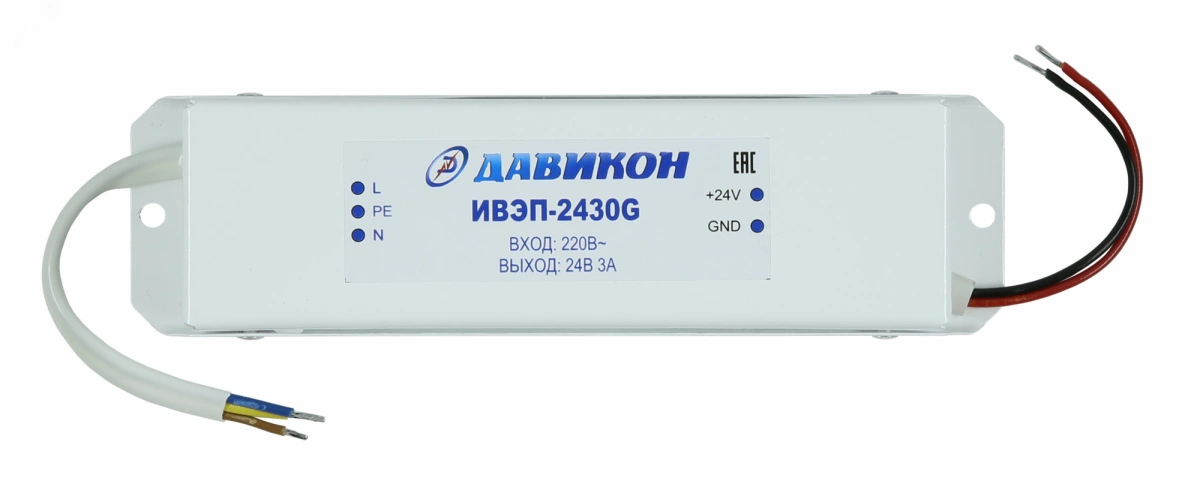 Давикон ИВЭП-2430G - источник вторичного электропитания стабилизированный. Металлический корпус герметичный (всепогодный, залитый компаундом). Предназначен для обеспечения электропитания потребителей при номинальном напряжением 24B постоянного тока 3А (максимальный 3.5А). Мощность 70Вт. Отличительные особенности Давикон ИВЭП-2430G - Электронная защита от КЗ, от перегрузки по току и перегрева, защита от перенапряжения по входу, низкие пульсации выходного напряжения, защита потребителя от перенапряжения и от импульсов до 4000В, с напряжением 24В. Корпус Металлический герметичный (всепогодный, залитый компаундом).