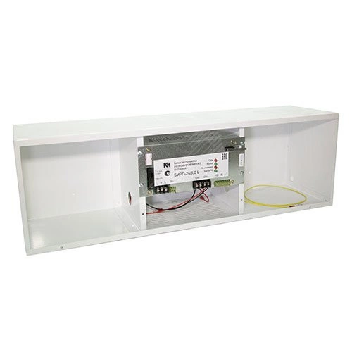Блок источника резервного питания. Основной источник электропитания сеть переменного тока 150 - 265В 50 Гц, выходное напряжение постоянного тока 24 В, номинальный ток нагрузки 6.0 А, максимальный ток нагрузки 6,5 А, под два аккумулятора 12 В 26-40 Ач, световая индикация - Сеть/Выход/АБ разряжена/Заряд АБ. Информационные выходы 'оптореле' о наличия выходного напряжения, наличии АБ , наличии сети, тампер. Электронная защита от короткого замыкания, защита аккумулятора от глубокого разряда, габаритные размеры 654х210х175 мм, металлический корпус, IP30. вес 10.0 кг