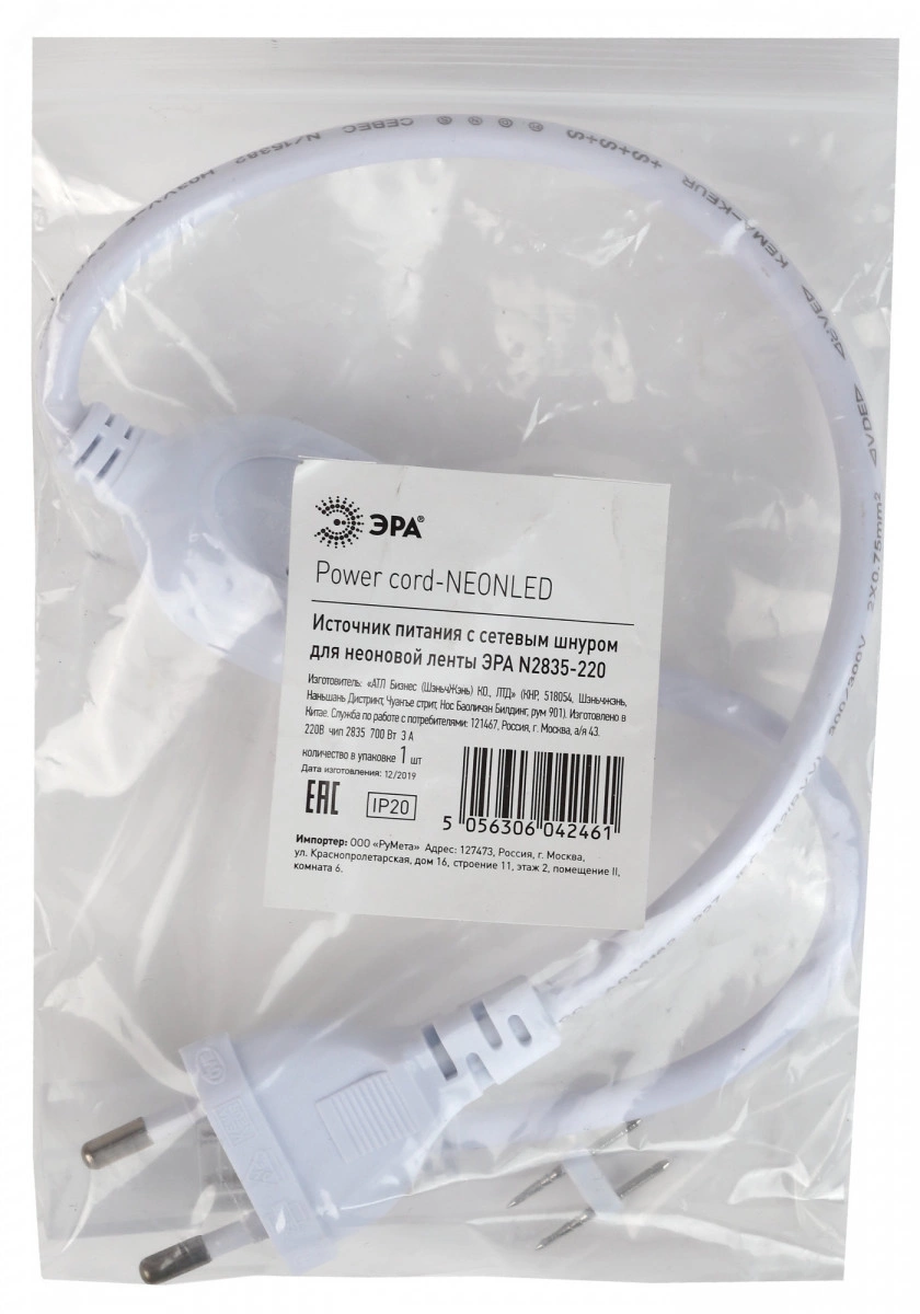 Источники питания ЭРА power cord - необходим для подключения светодиодной неоновой ленты к сети питания (розетке 220В). Напряжение 220В. Мощность 700 Вт.