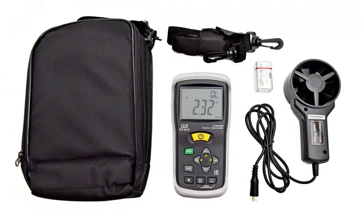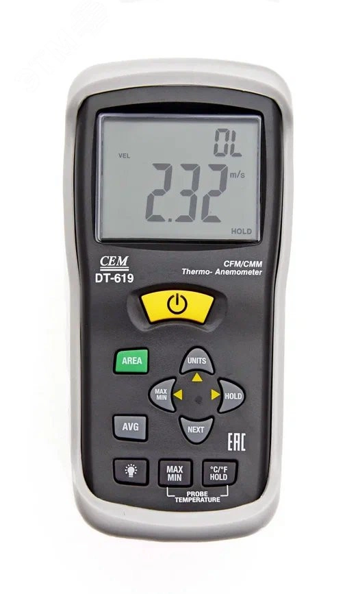 Высокая чувствительность и точность при измерении скорости потока воздуха. Удобный эргономичный дизайн. Большой дисплей LCD. Кабель 2 м. Функции Data/Max/Min hold.