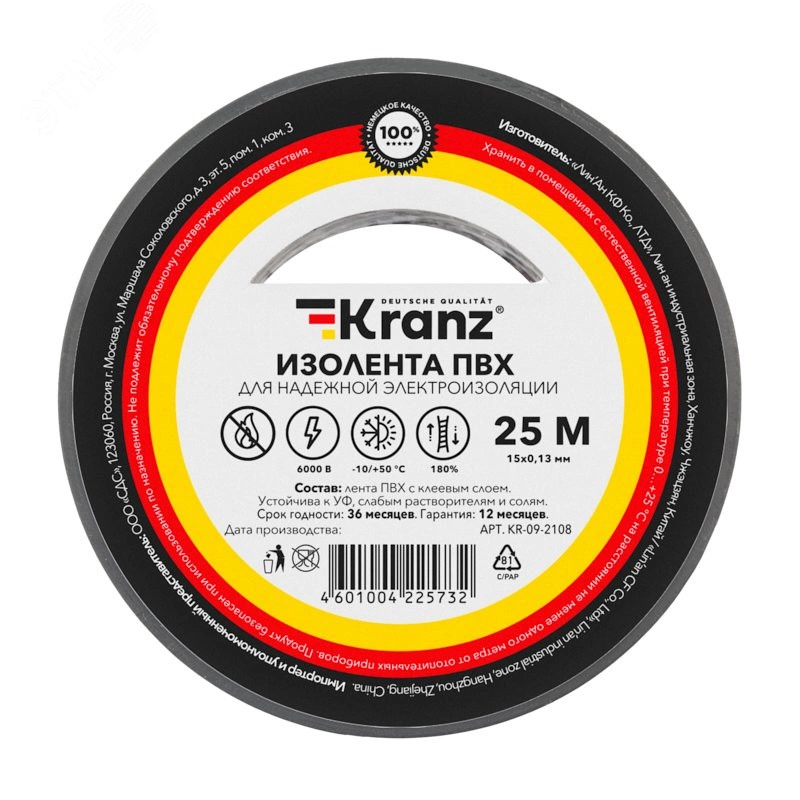 Изолента KRANZ предназначена для электрической изоляции, цветной маркировки, соединения, защиты от внешних факторов и герметизации кабелей, проводов и шнуров. Обеспечивает высокое качество обмотки и защищает места соединения от влаги, пыли, грязи, механических повреждений и перепадов температуры окружающей среды. Выполнена из высококачественной ПВХ-пленки с клеевым слоем.