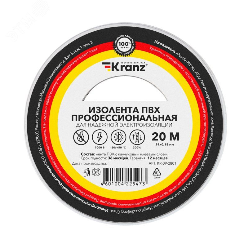 Профессиональная изоляционная лента KRANZ класса PREMIUM используется для электрической изоляции, цветной маркировки, соединения, защиты от внешних факторов и герметизации кабелей, проводов и шнуров. Находит широкое применение не только у профессионалов, но и в быту. Она имеет улучшенные технические характеристики (0,18 мм + суперлипкий клеевой слой), не подвержена климатическому старению, обеспечивает высокую механическую защиту, а так же устойчива к ультрафиолету, влажности, маслам и даже к растворам кислот и щелочей. Выполнена из высококачественной ПВХ-пленки с каучуковым клеевым слоем.