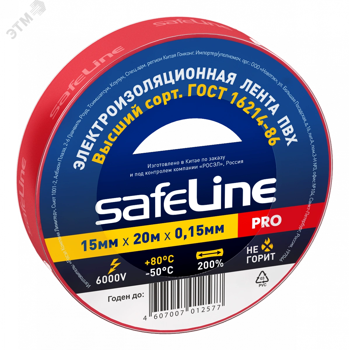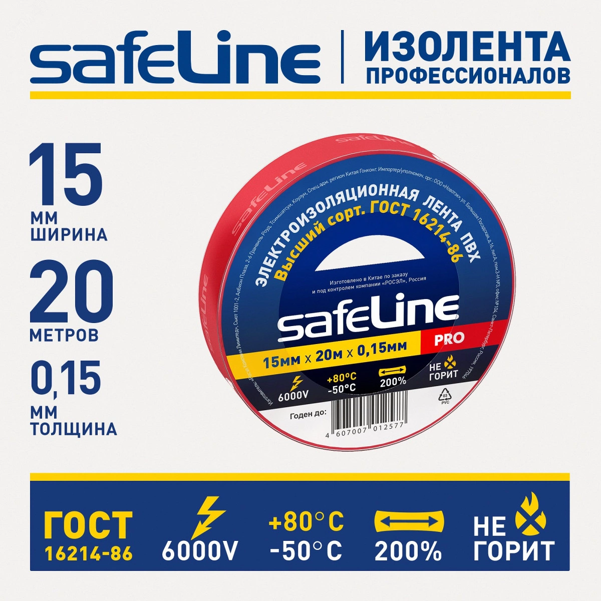 Изолента SAFELINE изготовлена на основе пленки из ПВХ изоляционного пластиката. Специальные добавки повышают эластичные свойства ленты, увеличивают ее долговечность и обеспечивают устойчивость к горению. Соответствует требованиям ГОСТ 16214-86 для изолент Высшего сорта. Изолента серии PRO предназначена для проведения электромонтажных работ и рекомендуется для профессионального и бытового применения.