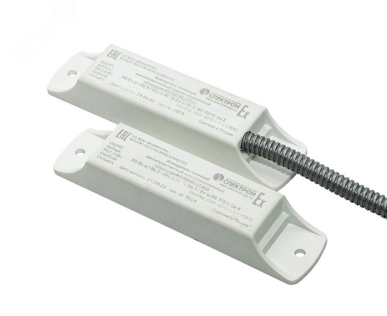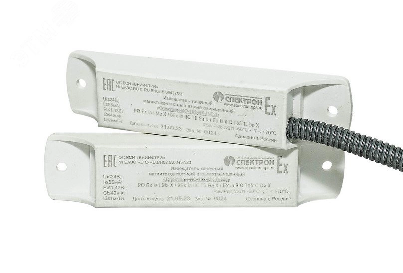 Извещатель точечный магнито-контактный Спектрон-ИО-102-МК-П-Exi-А. Предназначен для обнаружения проникновения в защищаемые помещения путем реакции на изменение положения охраняемой двери (люка) во входном проеме защищаемой конструкции с выдачей в шлейф приемно-контрольного прибора извещения о тревоге путем замыкания или размыкания контактов геркона.