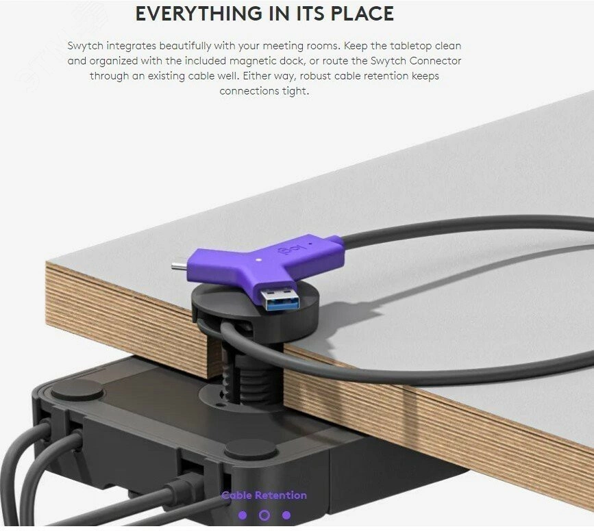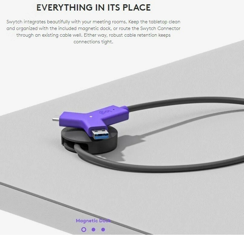 Кабель Logitech Cable Swytch - Y-образный кабель, предназначенный для подключения MacBook или ноутбука к системе конференций. Он обеспечивает соединение через USB-порты типов A и C. Кабель позволяет транслировать видео высокого качества с разрешением до 4К и подключать ноутбук к дисплею комнаты для проведения встреч. Управление устройством осуществляется через программу Logitech Sync, что облегчает мониторинг и управление устройствами конференц-зала, включая Logitech MeetUp, Rally и Tap.