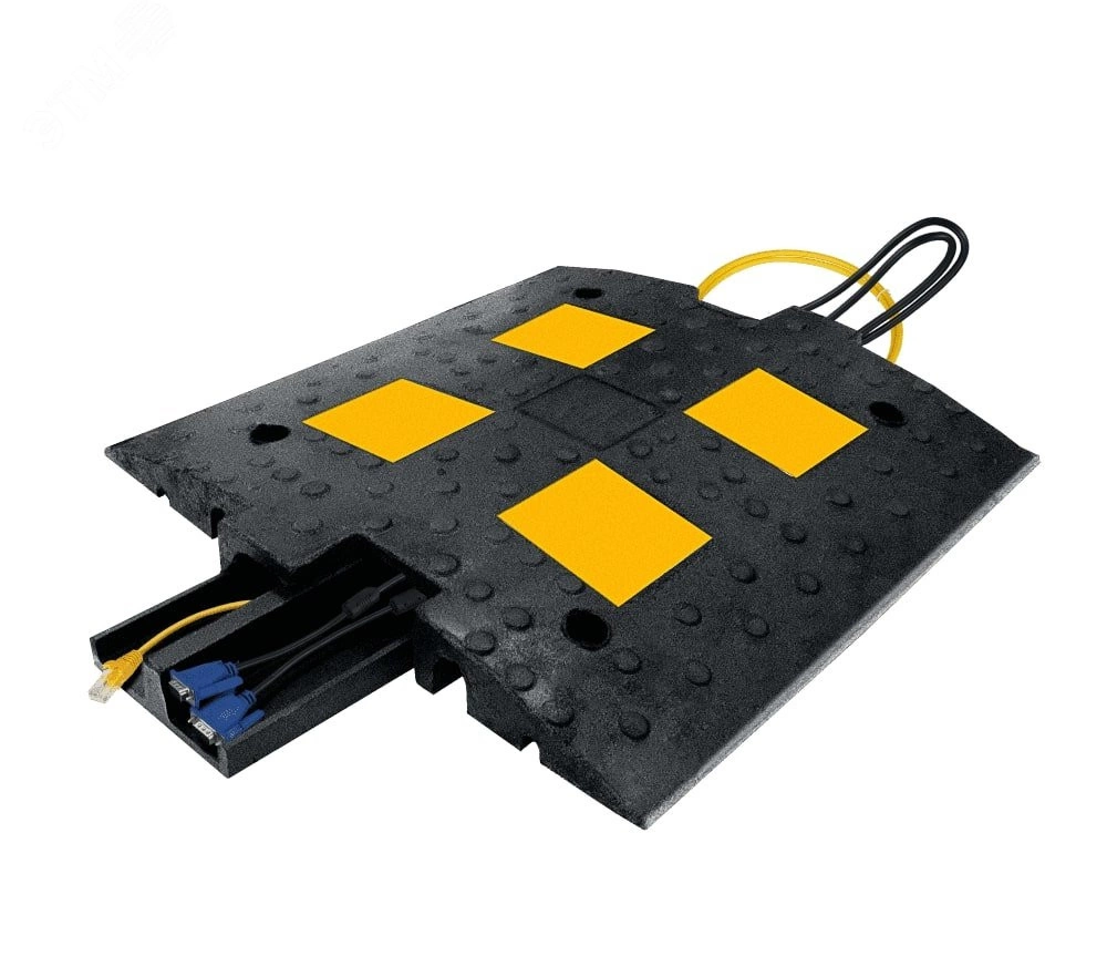 Кабель-канал ККК-500 с лотком изготовлен из композита. Практика показывает, что благодаря наличию на изделии выступов, обеспечивается отличное сцепление с шинами. Допустимая нагрузка составляет 30 тонн. Отличительной особенностью модели является функциональный лоток в нижней части, который представляет собой короб с двумя каналами для укладки проводов, труб, шлангов диаметром с сечением 39х46 мм и меньше.