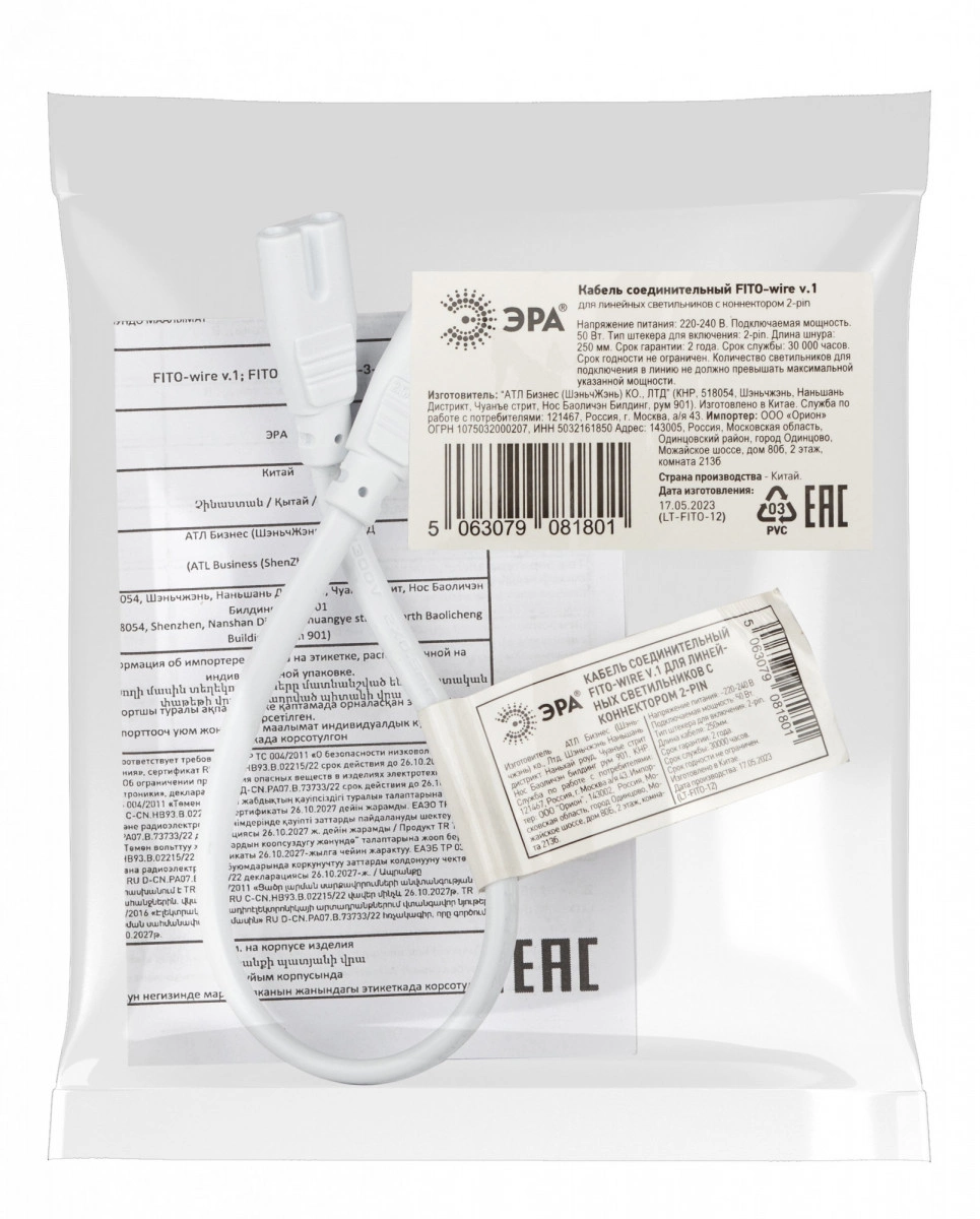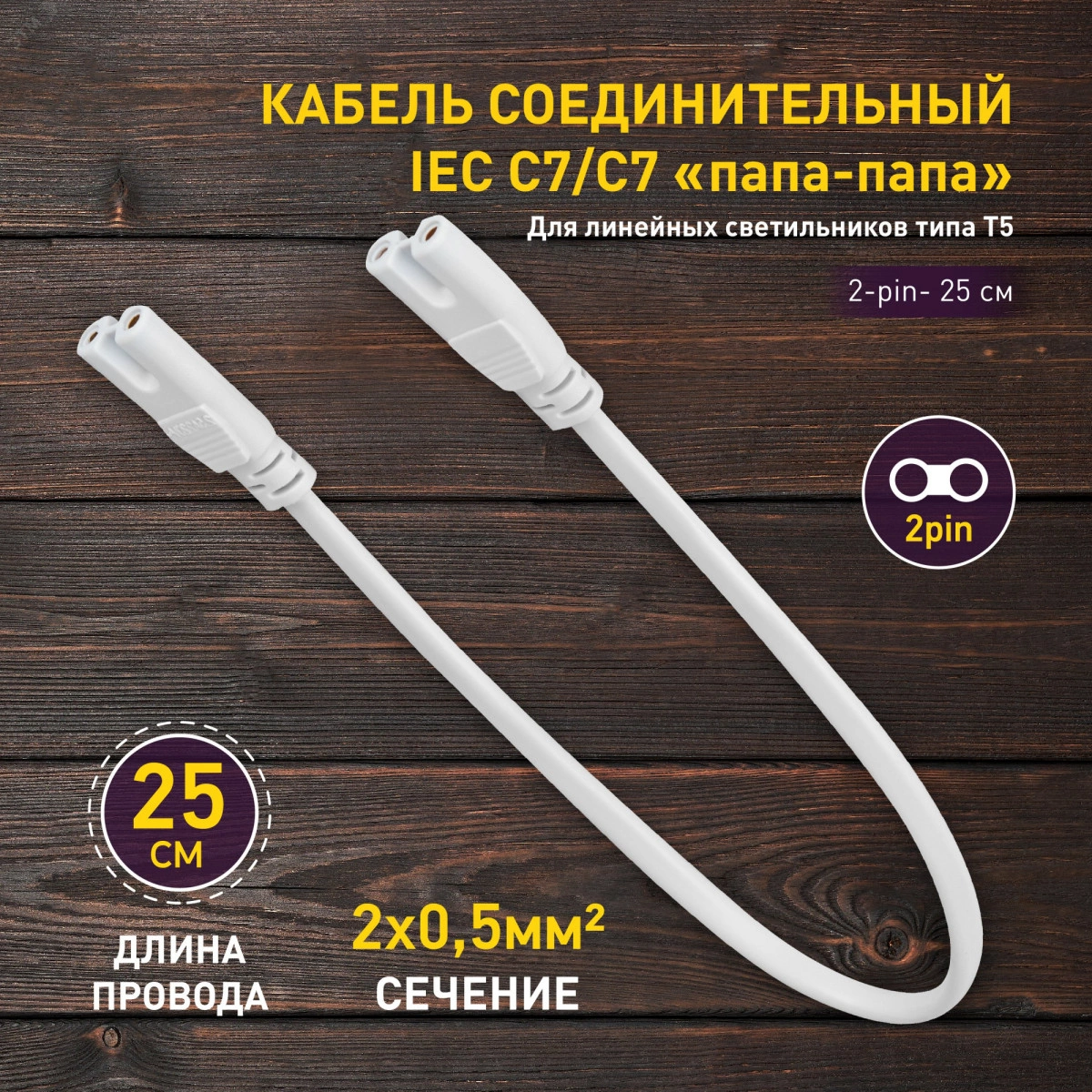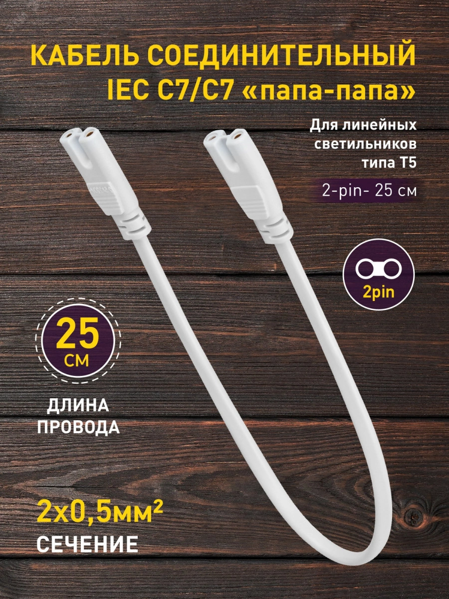 ЭРА FITO-wire v.1 - этот компактный, универсальный кабель подходит для большинства линейных светильников типа Т5 и используется для подключения нескольких светильников с коннектором 2-pin в единую цепь. Длина провода - 25 см. Двужильный кабель выполнен из поливинилхлорида, сечение 2х05 мм2.