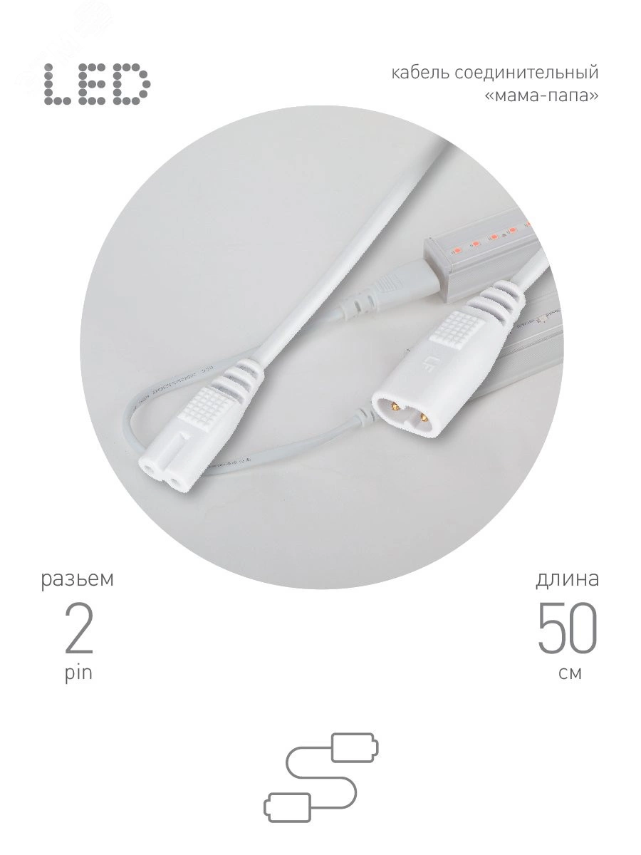 ЭРА FITO-wire v.2 - соединительный провод для подключения нескольких светильников в единую цепь. Подходит для серий линейных фитосветильников ЭРА FITO Т5-N и ЭРА Т5-Ra90. Длина - 50 см. Двужильный кабель ПВС 2х05 мм2. Двойной штекер С7 на двойной разъем С8.