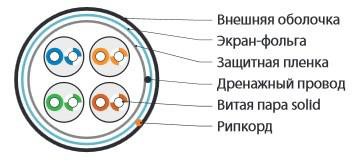 Кабель состоит из 4 пар однопроволочных проводников в изоляции из полиолефина, общий экран из фольги скреплен с оболочкой из ПВХ-компаунда. В конструкцию кабеля включены дренажный проводник и распарывающая нить. Экранирование обеспечивает лучшую защиту от электромагнитных наводок.