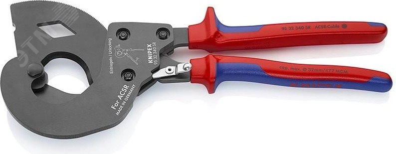Кабелерез для ACSR проводника Кабелерез подходит для сталеалюминиевого провода ACSR (алюминиевая жила, стальной сердечник) до диаметр 32 мм. При использовании одной или двумя руками повышенное рычажное усилие обеспечивает простую и точную обрезку. Компактный размер и удобство с высокой производительностью. Очень устойчивая двойная направляющая вращающегося лезвия. Кабель не деформируется - точная шлифовка режущей кромки с индукционной закалкой обеспечивает чистоту обрезки и долгий срок службы. Низкое требуемое усилие рук в связи с двухступенчатым передаточным приводом с храповым механизмом. ручка с прочной опорой для захвата и нажима рукой при резании. Стопорный механизм для транспортировки с надёжной фиксацией ручек в сомкнутом положении. На все изнашиваемые детали предлагаются сменные запчасти