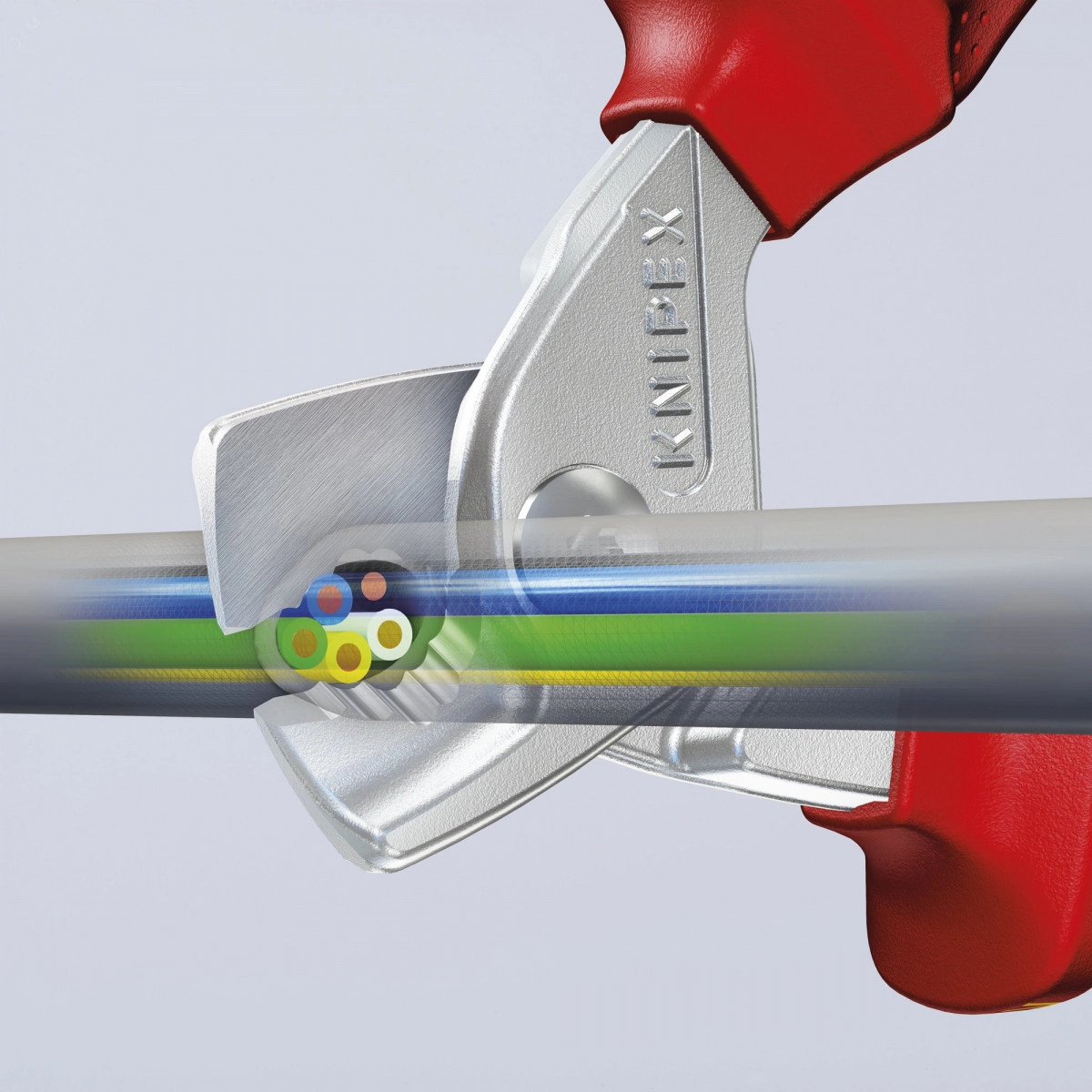 95 16 160 KNIPEX StepCut Компактный, легкий, мощный - удобный рез без заусенцев при размере всего 160 мм. Значительное снижение усилия - благодаря последовательному резу проводов, одного за другим, работать на 40% легче, в сравнении со стандартными кабелерезами того же размера!. Эргономичный дизайн рукоятки - комфортно резать даже кабели большого диаметра. Рез многожильных медных и алюминиевых кабелей до 15 мм (50 мм?). Рез одножильных медных и алюминиевых кабелей до 5 x 4 мм?. Рез без заусенцев. Болтовой шарнир - точный, лёгкий, надежный. Защита от защемления для безопасной работы. Не подходит для стальной проволоки и твёрдотянутых медных проводников. твердость режущих кромок примерно 56 HRC. - Параметры режима резки - медный кабель, многопроводный - 50mm? - Параметры режима резки - медный кабель, многопроводный - 15mm - AWG - 1/ 0 - Испытано на соответствие нормам VDE - да