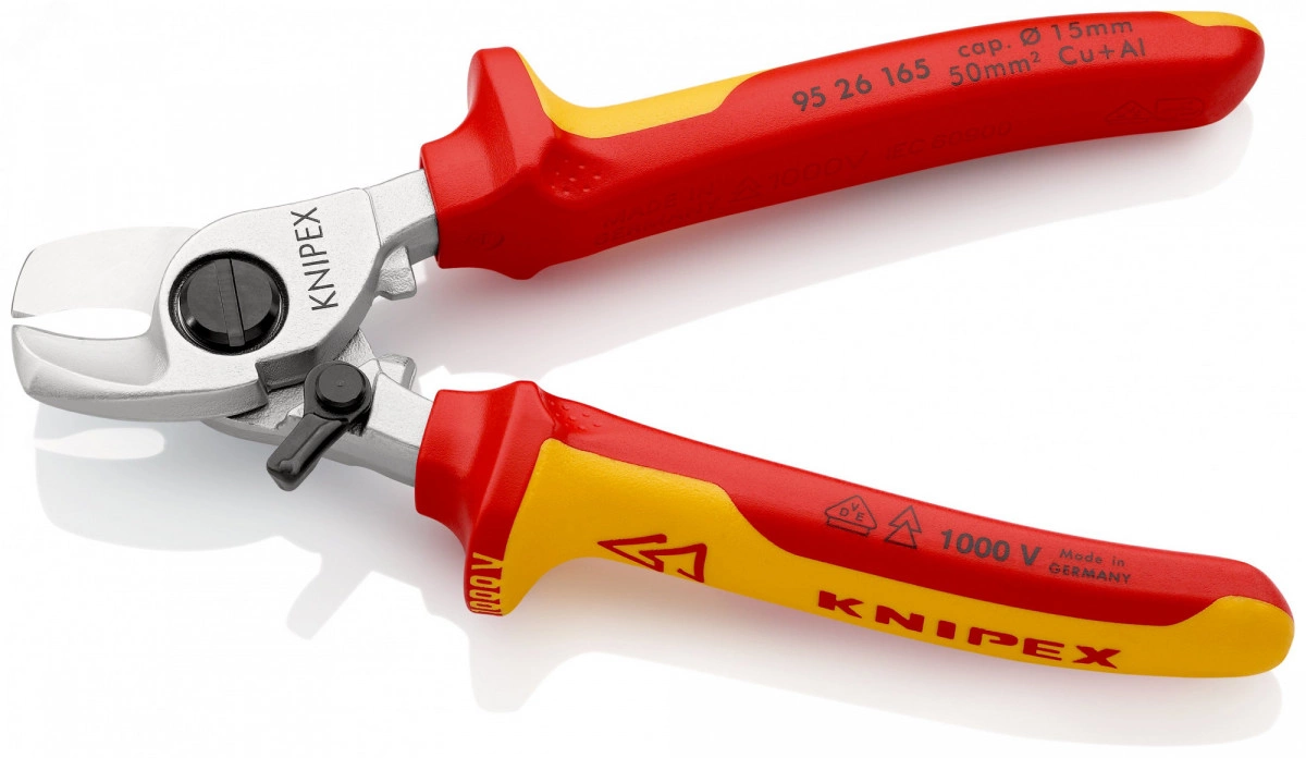 95 26 165 Кабелерез для реза медного и алюминиевого кабеля, одно- и многожильного. Режут гладко и чисто, без деформации материала. Не подходит для стальной проволоки и твёрдотянутых медных проводников. закаленные режущие кромки с прецизионной шлифовкой. легко резать одной рукой. с защитой для рук. регулируемый шарнир, винтовой, самофиксирующийся. внутренняя пружина, защищенная от загрязнения или ее утери. - Параметры режима резки - медный кабель, многопроводный - 50mm? - Параметры режима резки - медный кабель, многопроводный - 15mm - AWG - 1/ 0 - Испытано на соответствие нормам VDE - да