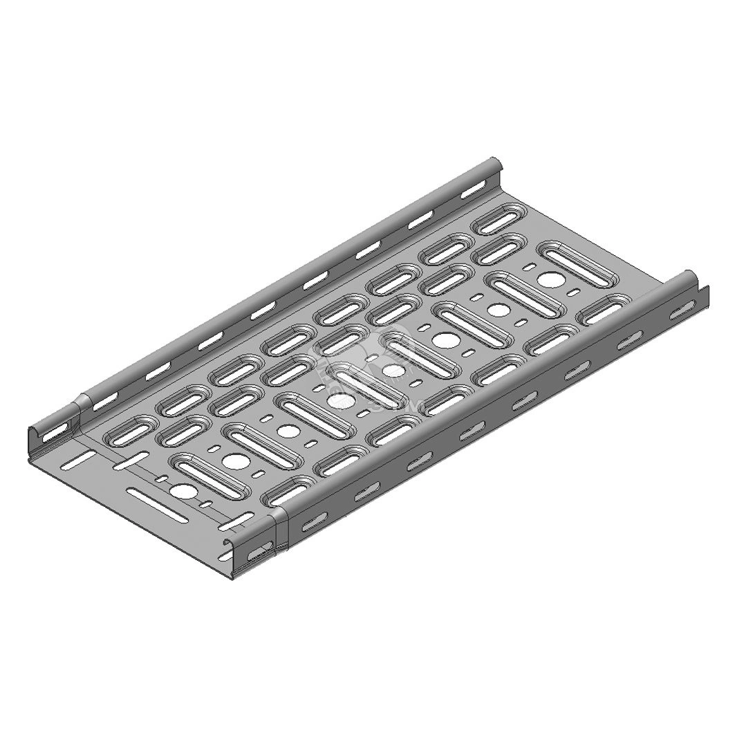 Телескопические концы, продольная и поперечная перфорация. Окантованные кромки бортов. Углубленная перфорация способствует увеличению несущей способности, улучшению охлаждения, повышению жесткости, лучшему отводу конденсата. Продольная и поперечная перфорация служит для удобного крепление на опорах и удобной фиксации кабеля. Схема перфорации различается в зависимости от ширины лотка. Поверхность телескопических концов закруглена для предотвращения повреждения кабелей. Предусмотрено отверстие для вывода труб диаметром 16 мм и 19,5 мм.