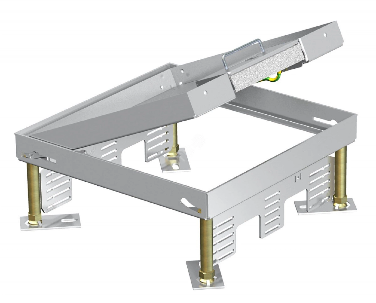 Регулируемая по высоте кассетная рамка номинального размера 9 с кабельным выводом, для монтажа электроустановочных изделий в полах с сухим типом уборки.