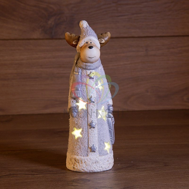 Керамическая фигурка ''Олененок с шарфом'' 7?6,5?21 см подарит ощущение сказки в преддверии зимних праздников, поможет красиво оформить интерьер и создать атмосферу уюта в вашем доме. Милый персонаж выполнен из экологичного материала, а фактурная поверхность покрыта безопасным красящим составом. Композиция включает множество проработанных деталей. На меховом кафтане оленя расположены 5 звездочек, через которые наружу проникает теплый белый свет, излучаемый 1 диодом, который работает от 2 батареек типа LR44. Элементы питания идут в комплекте.
