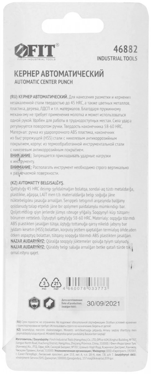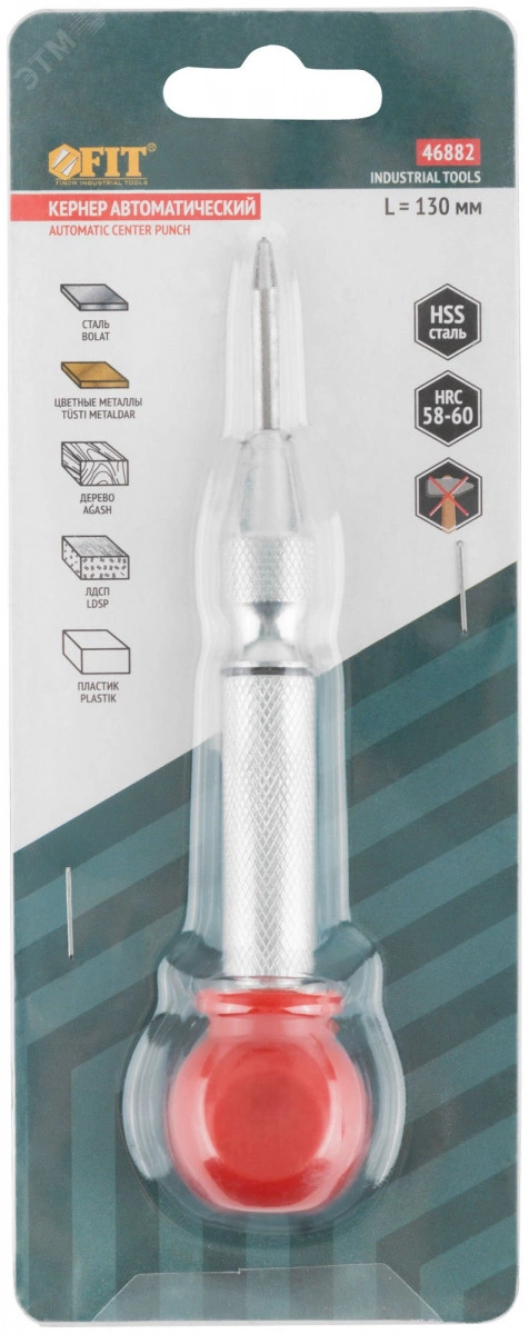 Кернер автоматический FIT IT предназначен для нанесения разметки и кернения незакаленной стали с твердостью до 45 HRC, а также цветных металлов, пластика, дерева, ЛДСП и т. п. Может использоваться в качестве стеклобоя. Конструкция кернера позволяет наносить разметку без использования молотка. Наконечник изготовлен из закаленной быстрорежущей стали и обладает высокой износостойкостью. Сила удара настраивается в зависимости от твердости обрабатываемого материала. Корпус кернера имеет текстурированную противоскользящую поверхность. Никелевое покрытие наконечника защищают от коррозии. Пластиковая рукоятка амортизирует энергию от удара кернера.