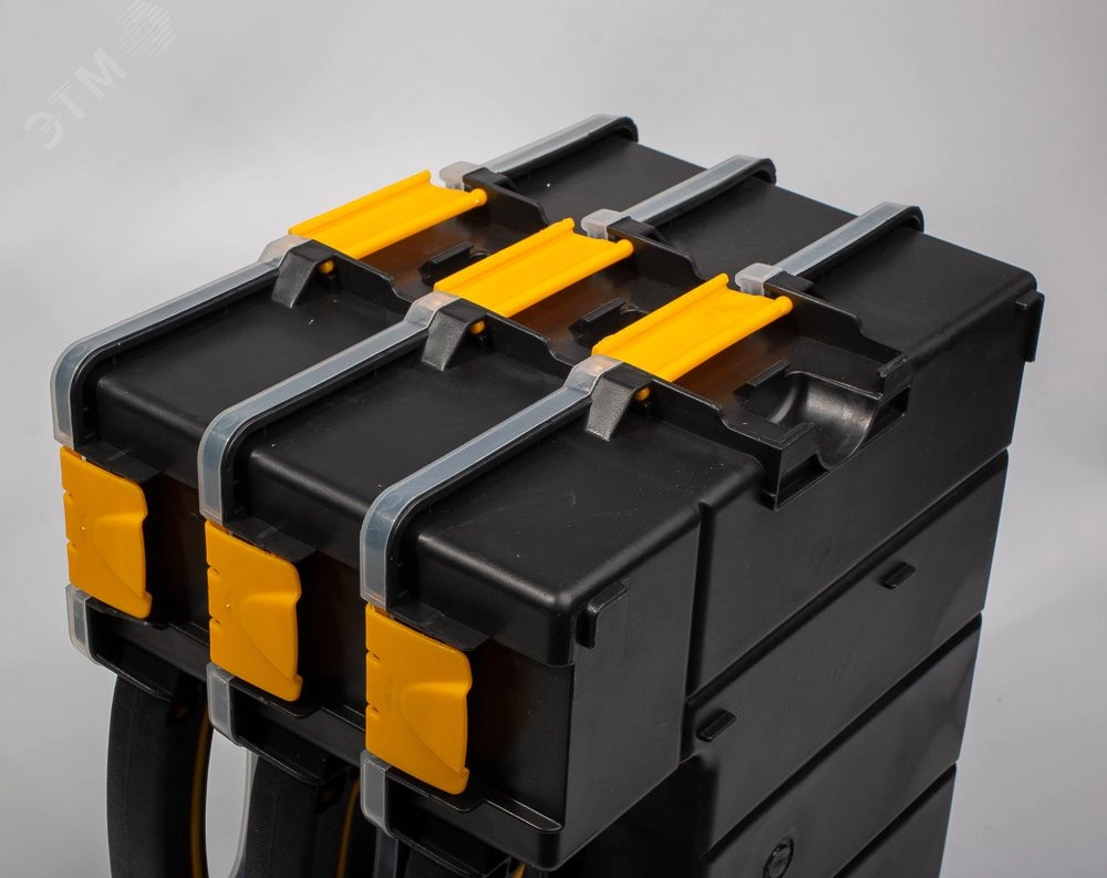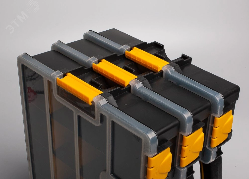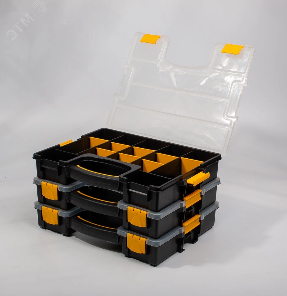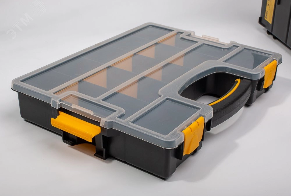 Пластиковый кейс-органайзер с модульными отделениями для хранения мелких деталей. В комплекте - пластиковый кейс, 8 разделительных пластин. Размеры основных отделений - 182х68 мм– 3 шт. 198х68 мм– 2 шт. 93х58 мм– 2 шт. 182х68 мм– 3 шт. 198х68 мм– 2 шт. 93х58 мм– 2 шт. При помощи разделительных пластин из 5 больших отделений можно сделать 13. Крышка кейса открывается на 90 градусов. Прозрачная крышка кейса позволяет с легкостью идентифицировать содержимое. Надежные замки для фиксации крышки кейса. Дополнительные боковые замки фиксируют крышку кейса или позволяют устанавливать и закреплять кейсы друг на друге. Прочная рукоятка со вставкой из мягкой нескользящей резины для переноски кейса. Ножки для установки кейса в вертикальном положении. Габариты кейса - 370х290х70 мм. Вес - 0.75 кг