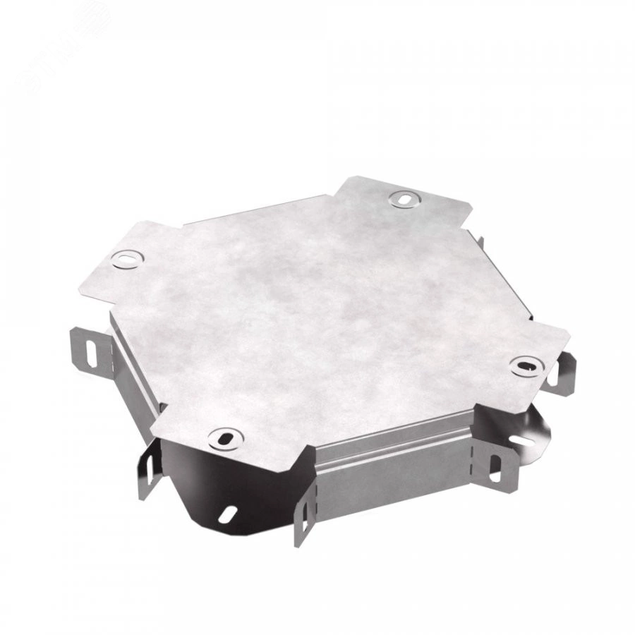 Аксессуары изготовленные из стали с защитным покрытием по методу Сендзимира - это изделия, на которых защитное цинковое покрытие было нанесено на листовую сталь перед изготовлением. Толщина защитного покрытия варьируется от 10 до 22мкм. Климатическое исполнение изделий УХЛ2, что предусматривают эксплуатацию в помещении и под навесом, при температуре эксплуатации от -80 до +150С. Ответвитель X-образный предназначен для разветвления кабельных трасс в горизонтальном направлении, для перфорированных и глухих лотков. В комплект входит крышка.