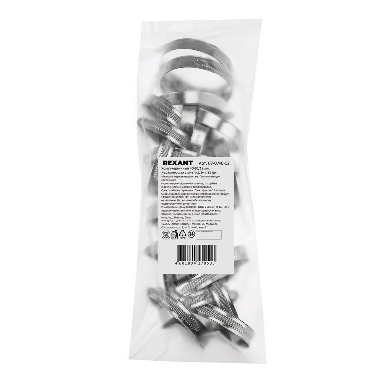 Полное описание: Хомут червячный 40-60/12-0.8мм нержавеющая сталь W2 (уп.25шт) Rexant 07-0740-12
