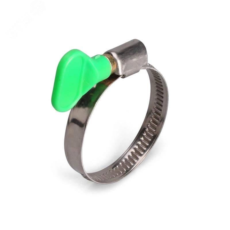Для крепления шлангов, патрубков и труб. Материал - нержавеющая сталь AISI 201. Максимальный разрушающий момент - 8 Н*м. Конструкция червячного узла обеспечивает необходимый зазор и оптимальный угол резьбы в паре винт-лента, что позволяет равномерно распределить усилие сжатия по периметру и увеличить предельный момент затяжки. Плавная бесступенчатая затяжка. Нержавеющая сталь обеспечивает долговечное и надежное крепление в агрессивных средах. Конструкция хомутов предполагает многократные циклы монтажа-демонтажа. Благодаря специальной отбортовке по краям ленты хомуты не повреждают поверхность, на которую они монтируются. Сглаженные кромки ленты предохраняют руки от травм и порезов при монтаже. Червячные хомуты с головкой винта, выполненной в форме бабочки или барашка, были разработаны для условий, в которых необходимо часто снимать и подключать шланги. Инструмент для монтажа - торцевой ключ '7', отвертка шлиц или PH