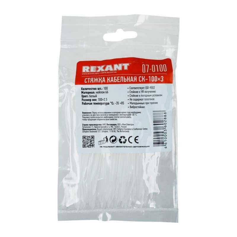 Хомут нейлоновый (кабельная стяжка) 100х2,5 мм белый REXANT предназначен для крепления или обвязки в жгут кабелей и проводов, крепления гибких гофротруб, а также других предметов к несущей поверхности или для соединения между собой. Такая стяжка используется при проведении электромонтажных работ, при монтаже структурированных кабельных систем, для бытовых нужд, а также в других отраслях народного хозяйства.