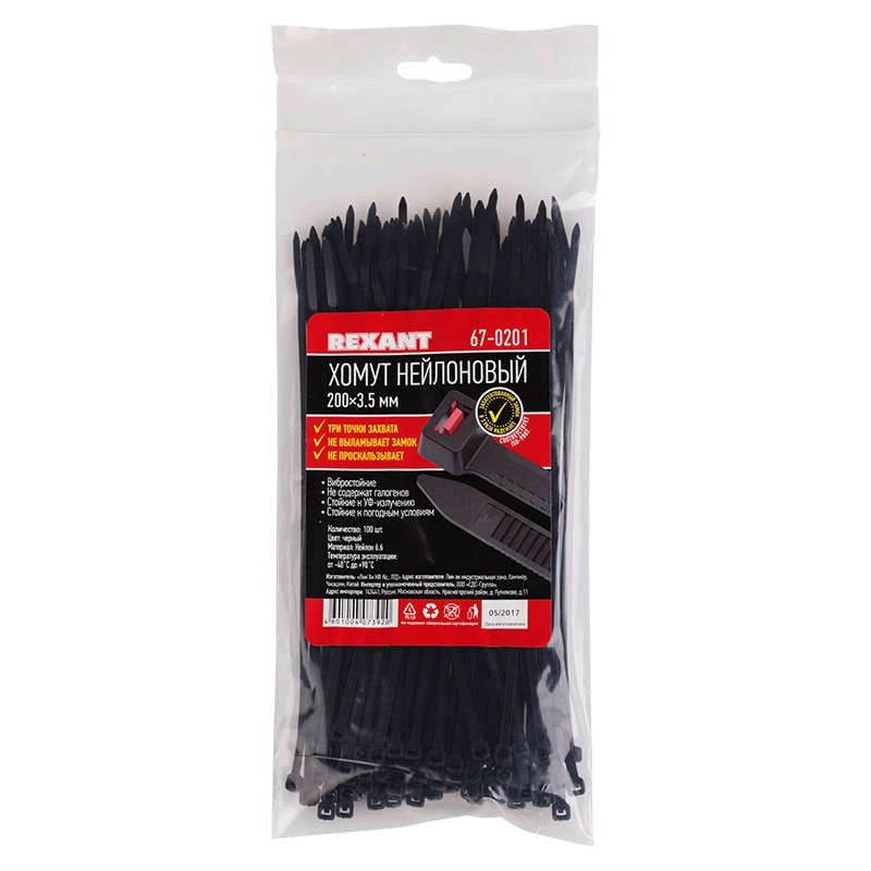 Хомут нейлоновый (кабельная стяжка) 200х3,6 мм чёрный «Тройной замок» предназначен для крепления или обвязки в жгут кабелей и проводов, крепления гибких гофротруб, а также других предметов к несущей поверхности или для соединения между собой. Используется при проведении электромонтажных работ, при монтаже структурированных кабельных систем, для бытовых нужд, а также в других отраслях народного хозяйства.