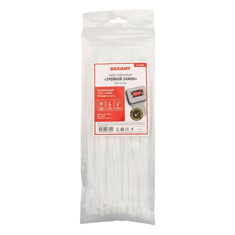 Хомут кабельный 3.6х250 тройной замок нейл. бел. (уп.100шт) Rexant 67-0250