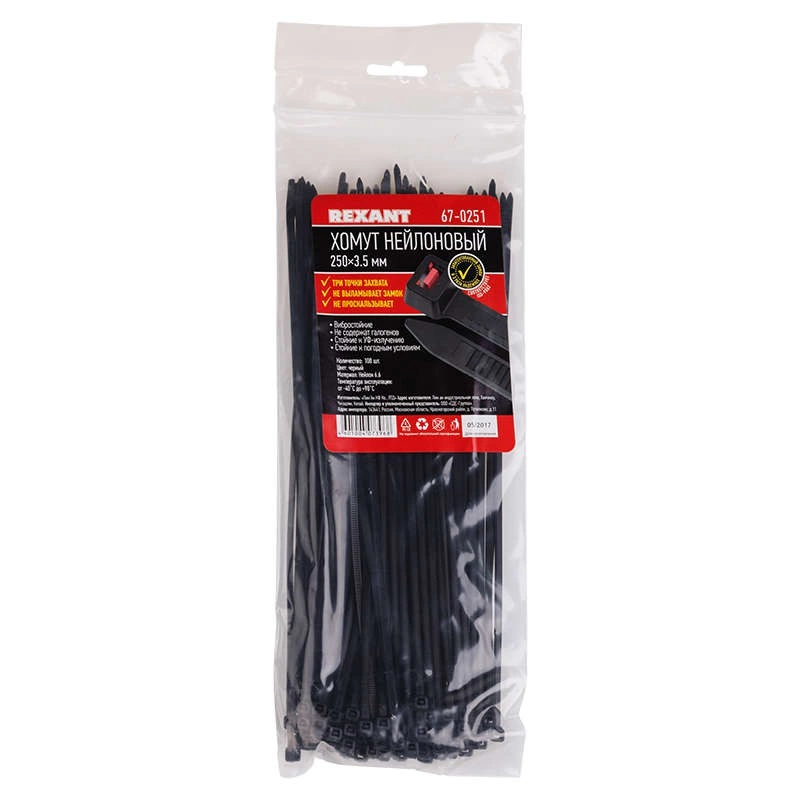 Хомут нейлоновый (кабельная стяжка) 250х3,6 мм чёрный «Тройной замок» предназначен для крепления или обвязки в жгут кабелей и проводов, крепления гибких гофротруб, а также других предметов к несущей поверхности или для соединения между собой. Используется при проведении электромонтажных работ, при монтаже структурированных кабельных систем, для бытовых нужд, а также в других отраслях народного хозяйства.