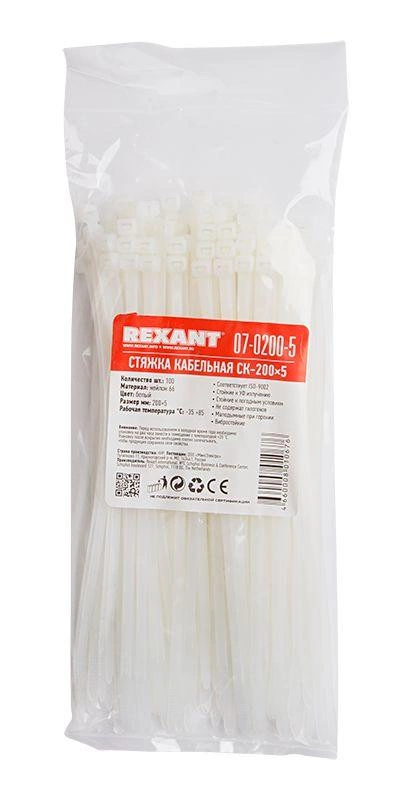 Хомут нейлоновый (кабельная стяжка) 200х4,8 мм белый REXANT предназначен для крепления или обвязки в жгут кабелей и проводов, крепления гибких гофротруб, а также других предметов к несущей поверхности или для соединения между собой. Такая стяжка используется при проведении электромонтажных работ, при монтаже структурированных кабельных систем, для бытовых нужд, а также в других отраслях народного хозяйства.