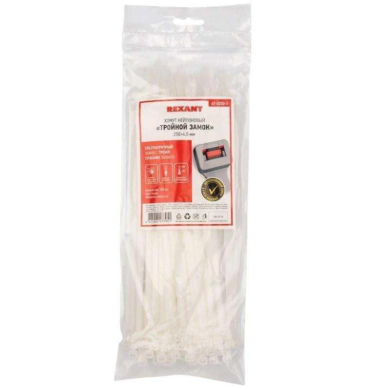 Полное описание: Хомут кабельный 4.8х250 тройной замок нейл. бел. (уп.100шт) Rexant 67-0250-5