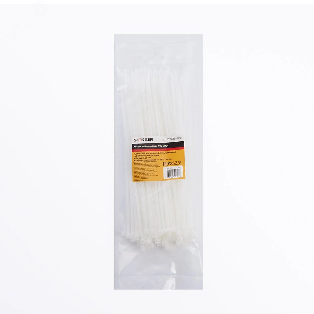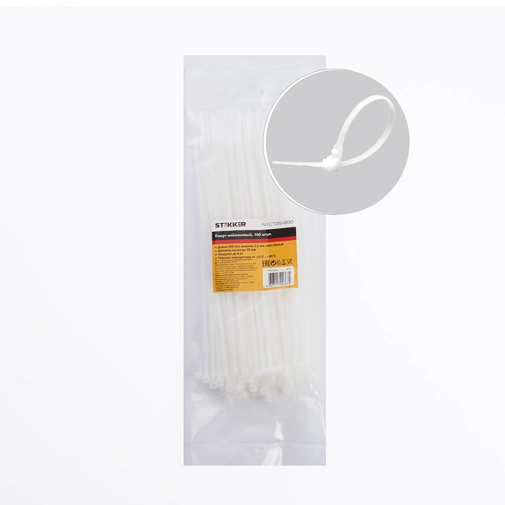 Полное описание: Хомут нейлоновый 2,5x200 мм, d пучка max 50 мм, нагрузка 8 кг, белый, (100шт в упак), Stekker