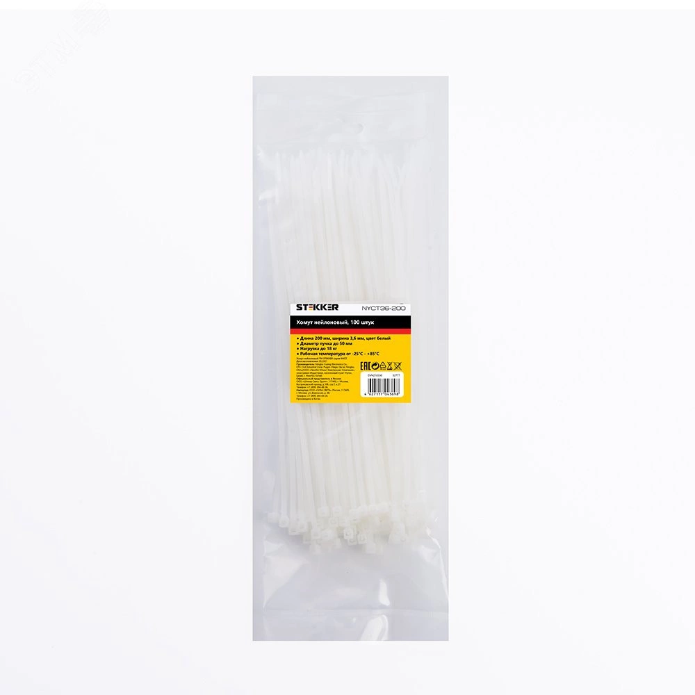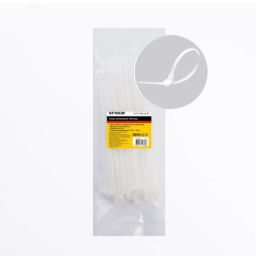 Полное описание: Хомут нейлоновый 3,6x200 мм, d пучка max 50 мм, нагрузка 18 кг, белый, (100шт в упак), Stekker