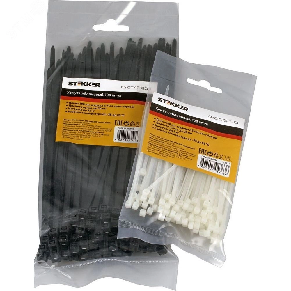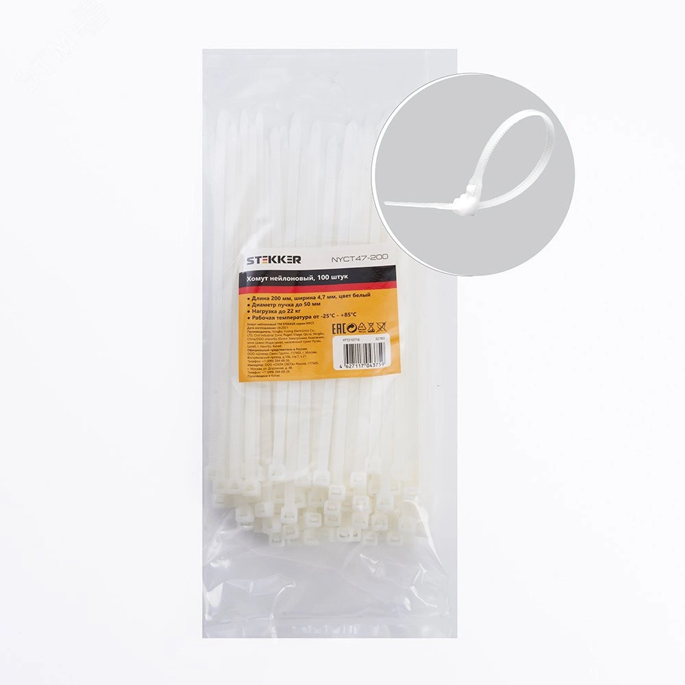 Полное описание: Хомут нейлоновый 4,7x200 мм, d пучка max 50 мм, нагрузка 22 кг, белый (100шт в упак) Stekker