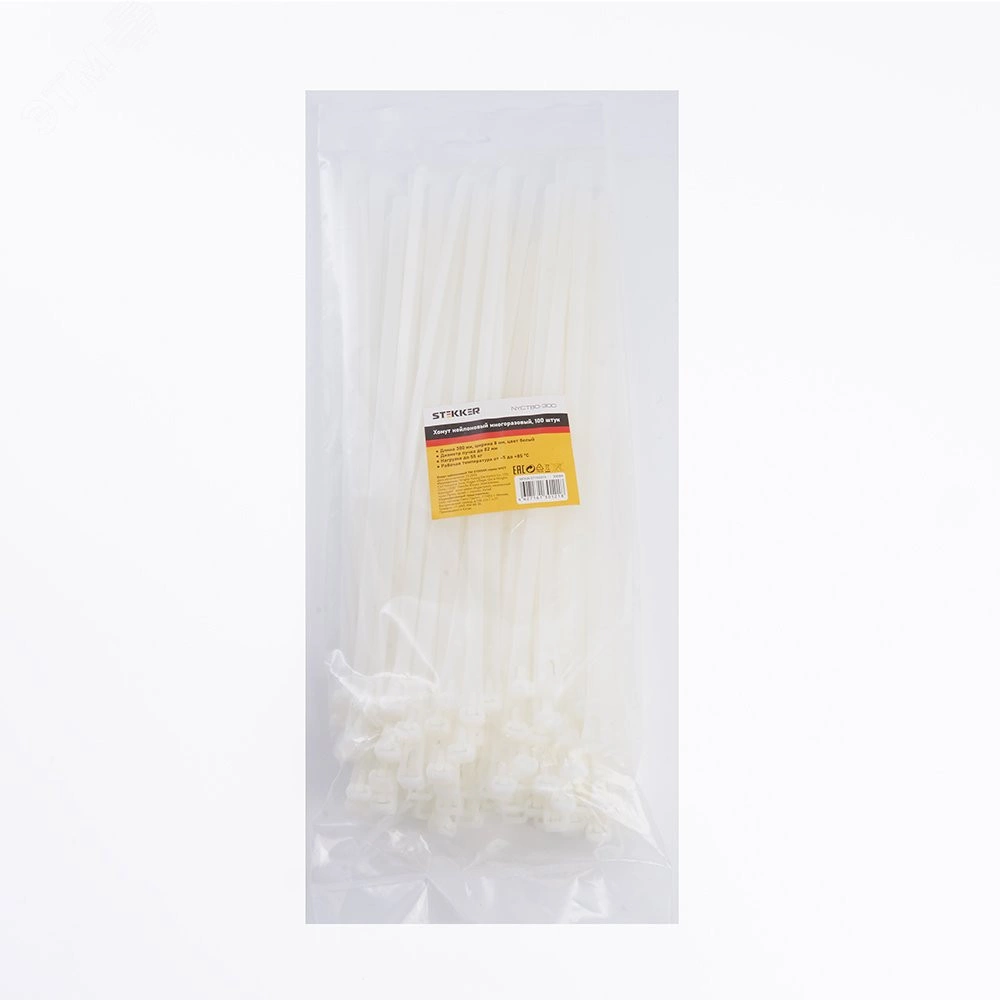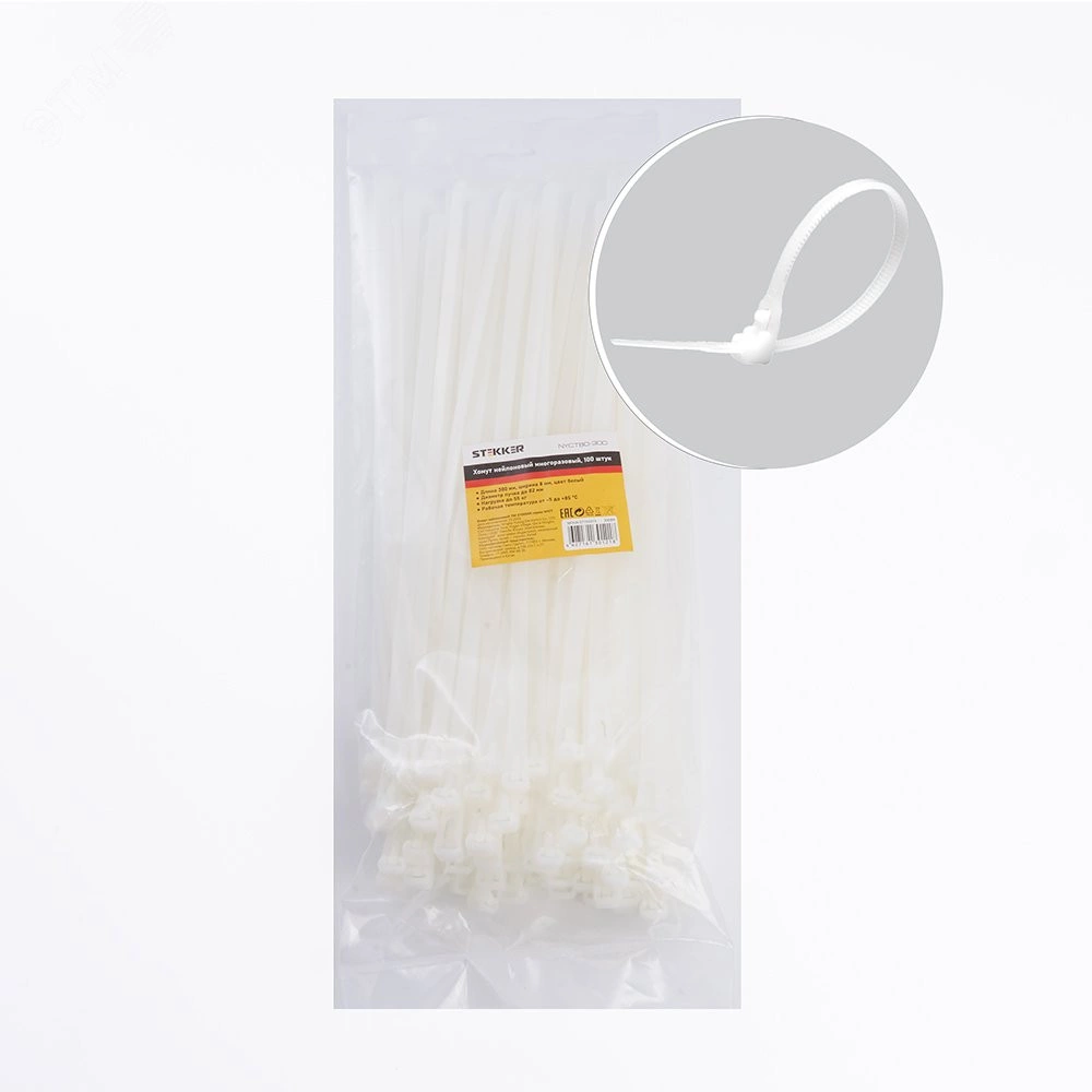 Полное описание: Хомут нейлоновый многоразовый 8x300мм, белый (100шт в упак) Stekker
