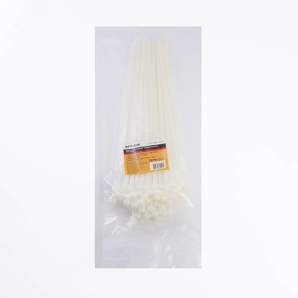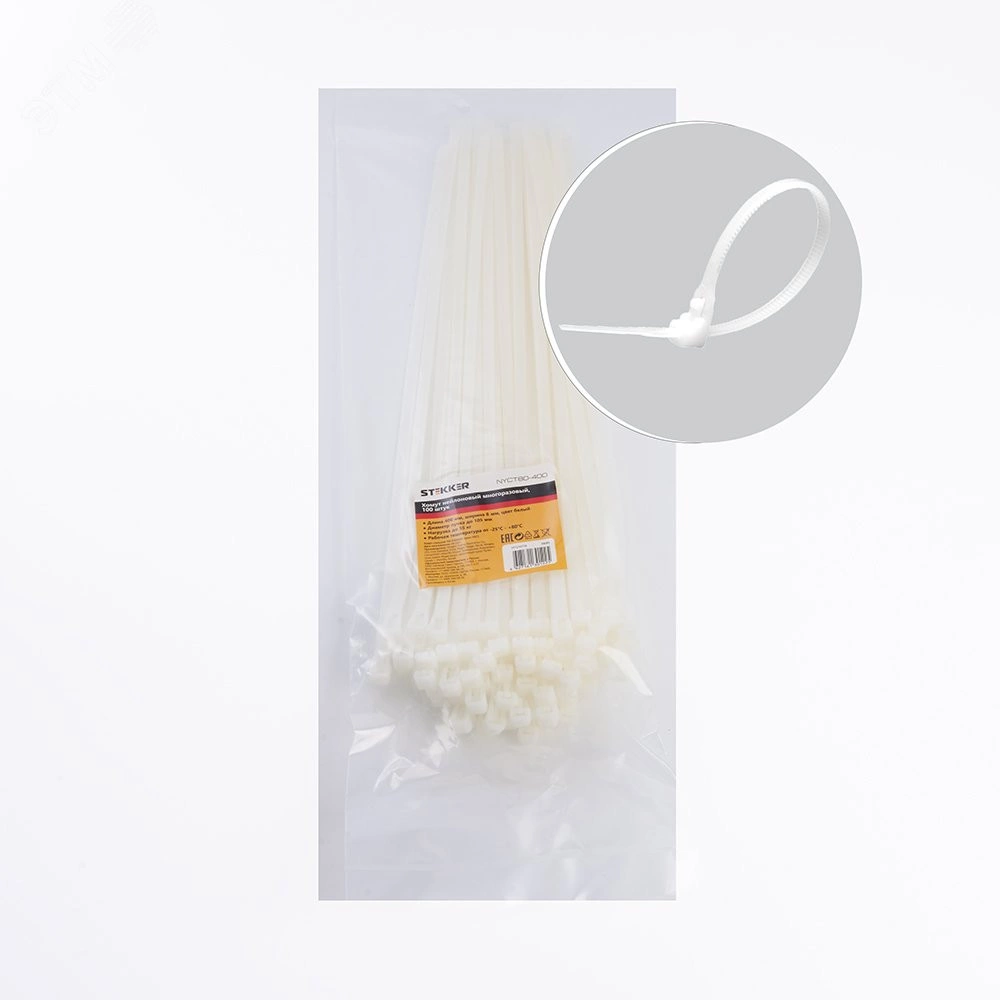 Полное описание: Хомут нейлоновый многоразовый 8x400мм, белый (100шт в упак) Stekker