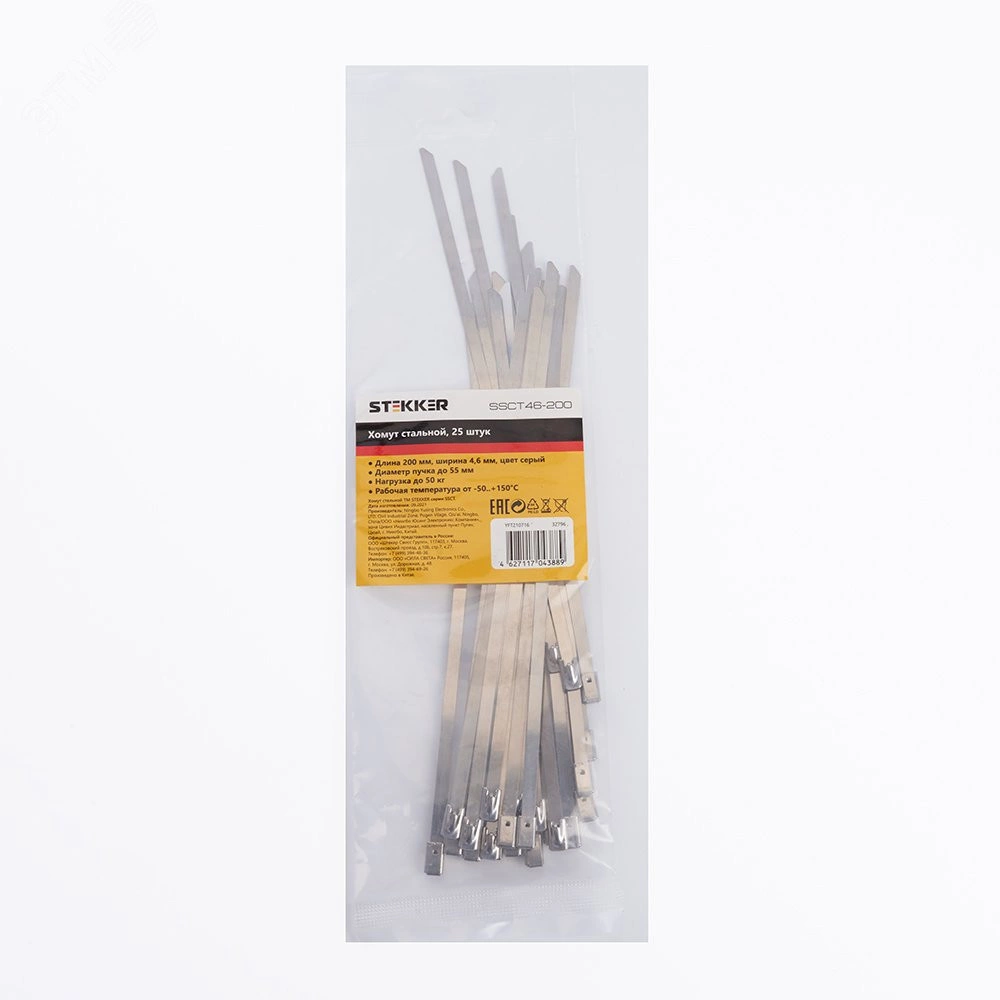 Полное описание: Хомут стальной 4,6х200мм, d пучка max 55мм, нагрузка 50кг, серый (25шт в упак) Stekker