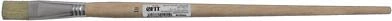 Плоская. Для работы со всеми видами лакокрасочных материалов. Натуральная светлая щетина, деревянная ручка.
